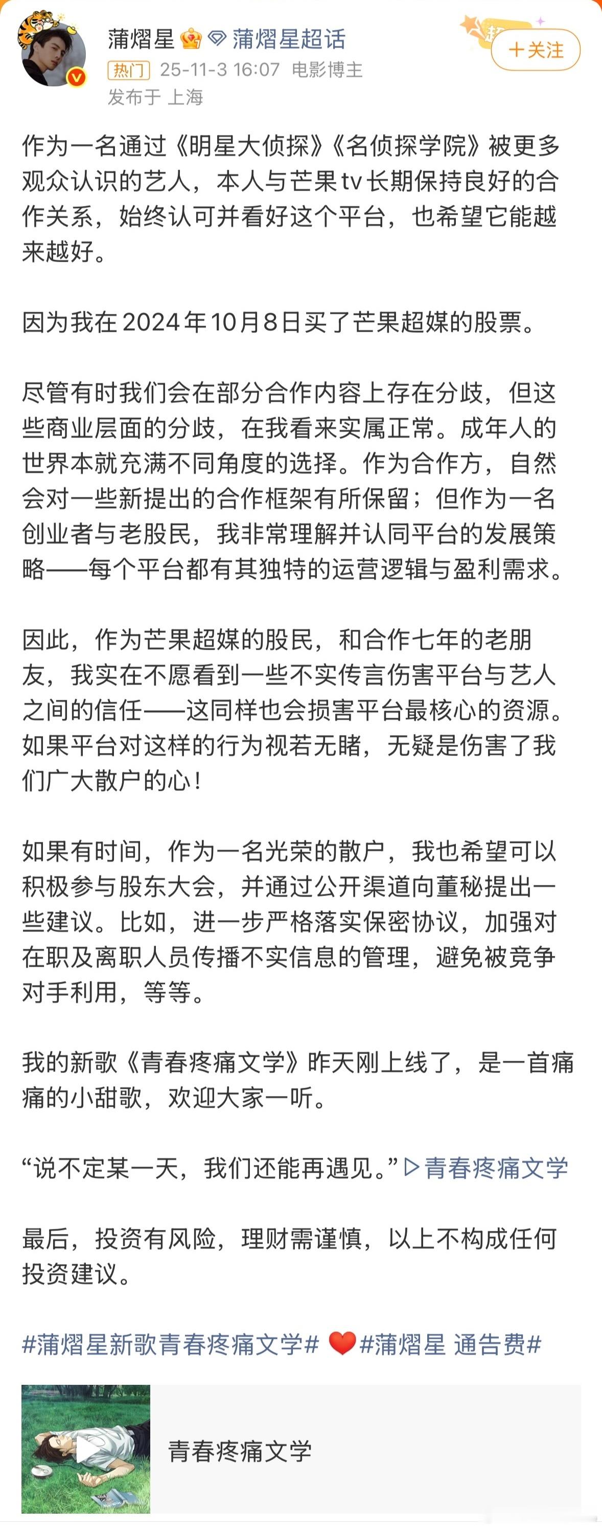 蒲熠星出来回应网传的“男艺人要6位数通告费被平台封杀”这个人是他这件事了[思考]