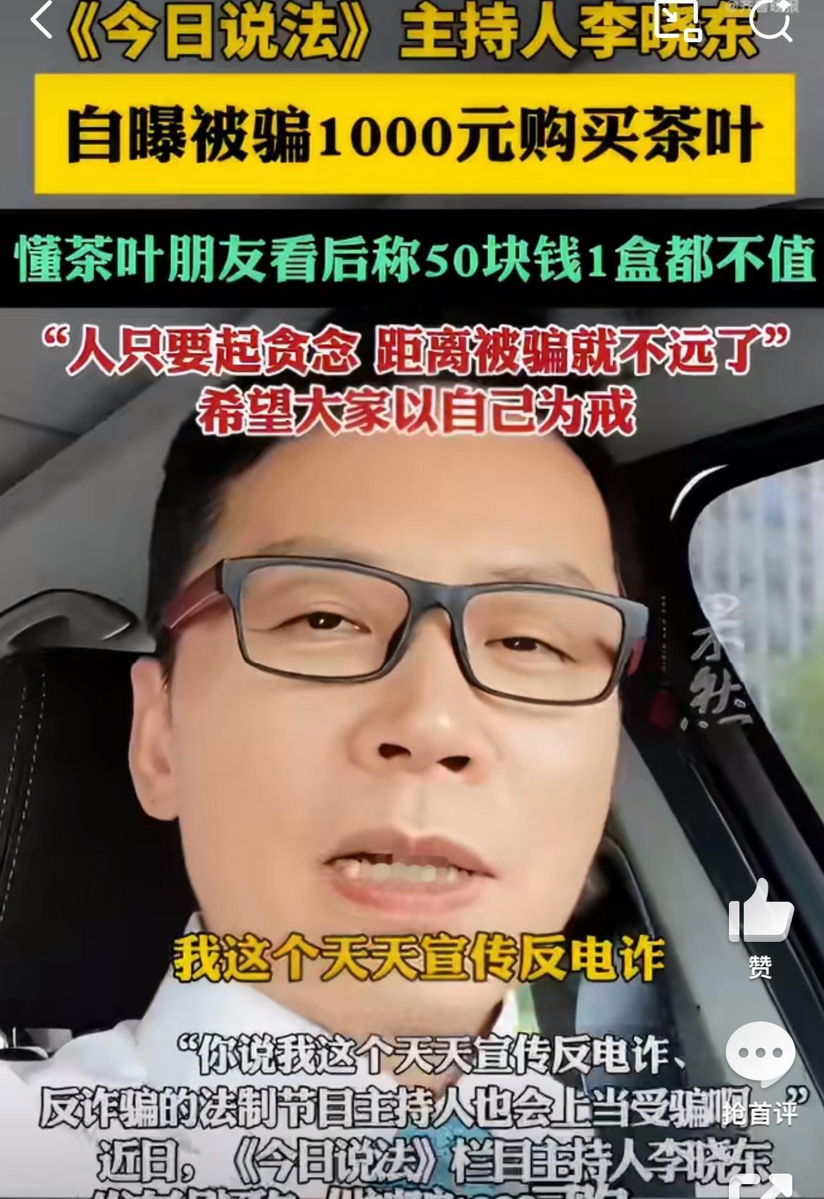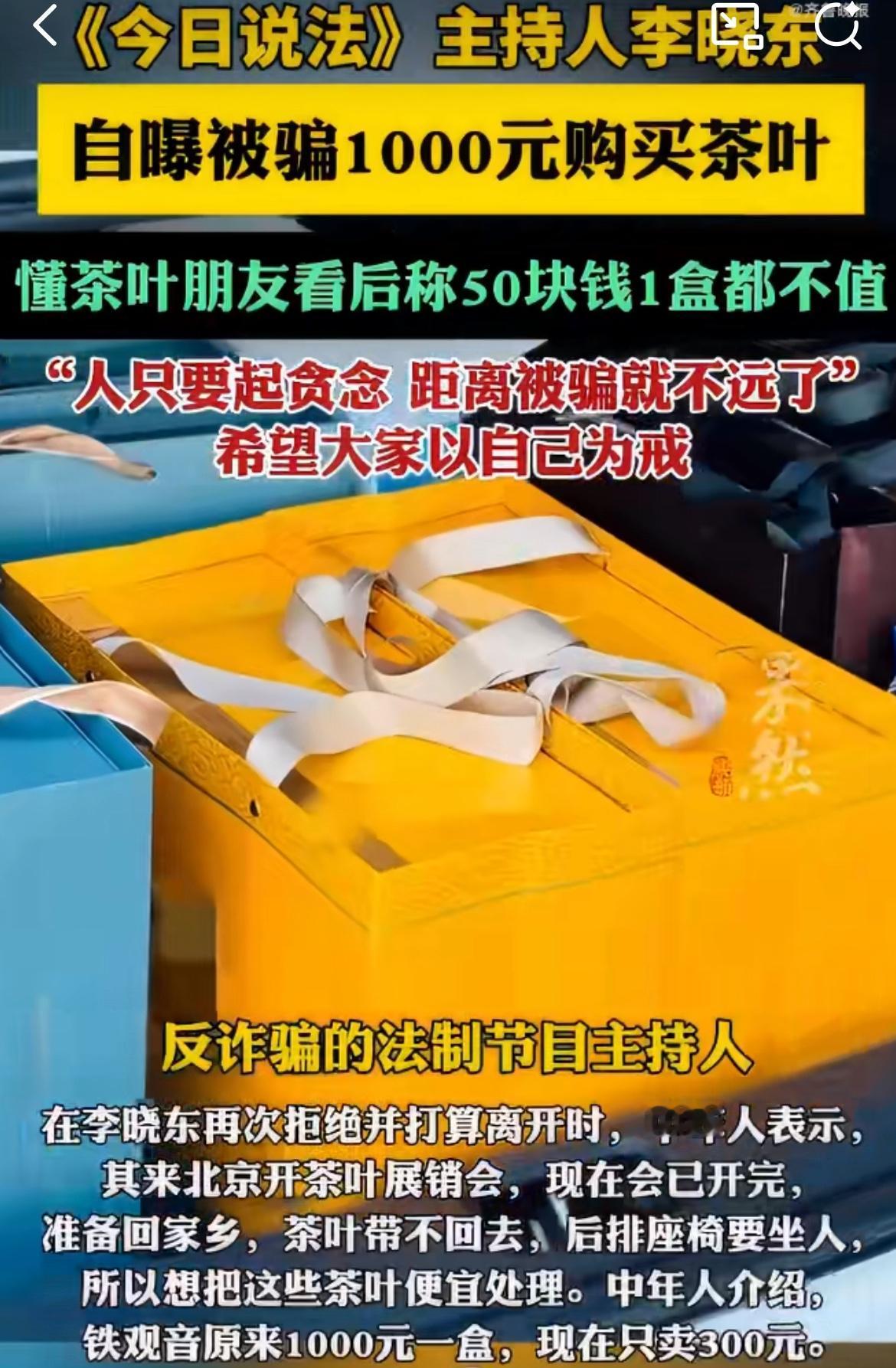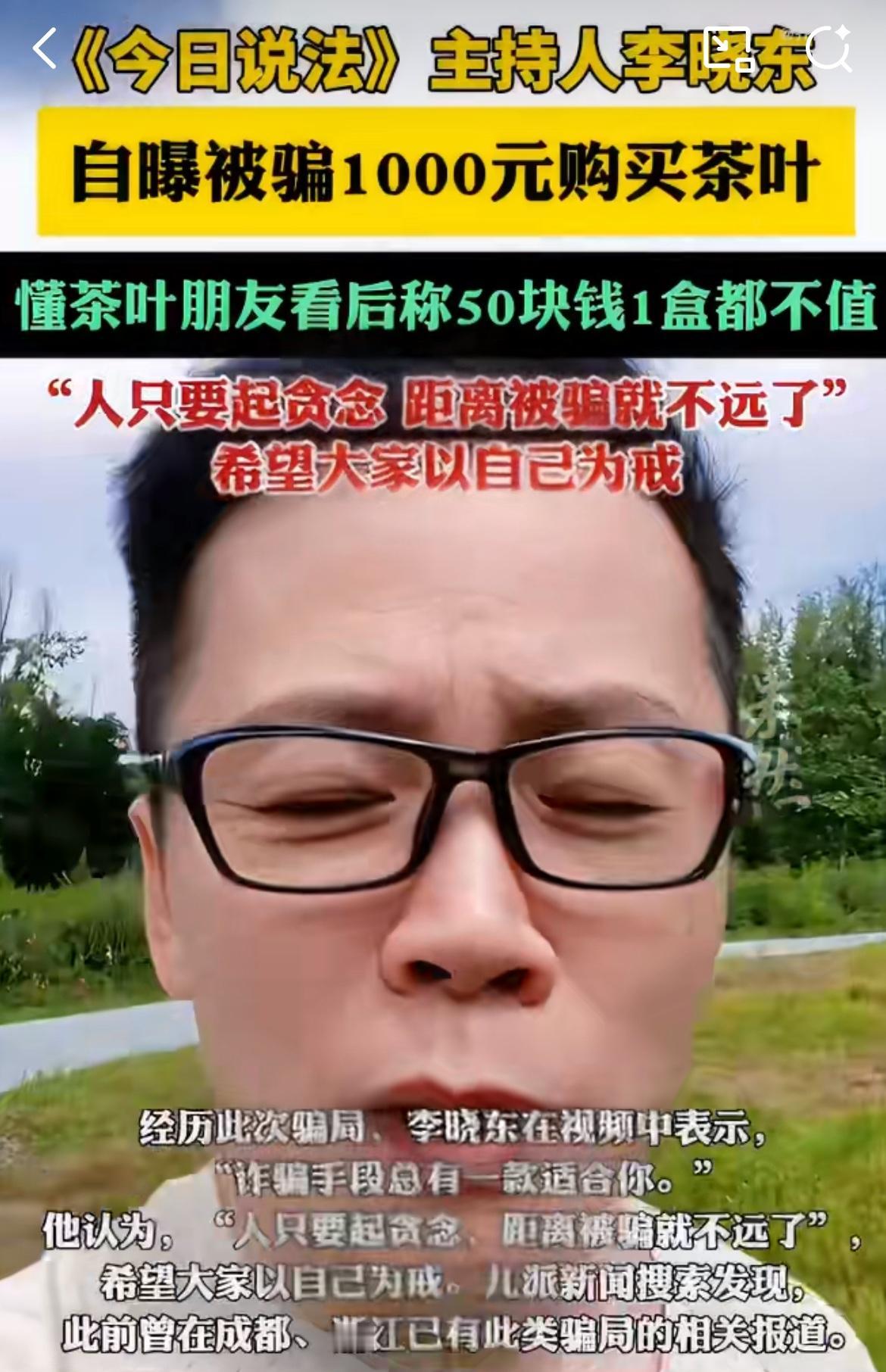太讽刺,今日说法主持人李晓东遭遇茶叶骗局,被开奔驰男子骗走1000块。说起来这个骗局很早就有,可是天天普法、教大家防骗的法制栏目主持人现实中依然不堪一击。 李晓东说自己去银行办事,在路上遇到个中年人问要不要茶叶。李晓东不喝茶,本来不想要。结果人家硬邀请他去看,成年人的好奇心害死人啦。 男子打开奔驰车,后备箱、车尾箱满满都是包装精美的茶叶。男子说,自己来参加展会的,茶叶带不走,因为车上要坐人,茶叶想低价处理。这些铁观音原价都是1000多块钱一盒,现在300一盒,问李晓东要不要。李晓东要走,男子说要不200。李晓东心动了,以1000元买了5盒。 茶叶带回去后,李晓东越想越不对劲,问了下懂茶叶的朋友。上当了,这种茶叶都是香精勾兑,值钱的是盒子,里面的茶叶比树叶子还不如。 今日说法的栏目主持人,天天接触各种法律案件,对于防诈防骗的经验学习了不少,但是纸上得来终觉浅。现实中,人性的好奇心,贪婪,骗子不过采取略施小计,就能让人轻易上钩。所以在路上,陌生人抛来的善意,除了问路,其他一概不用搭理。