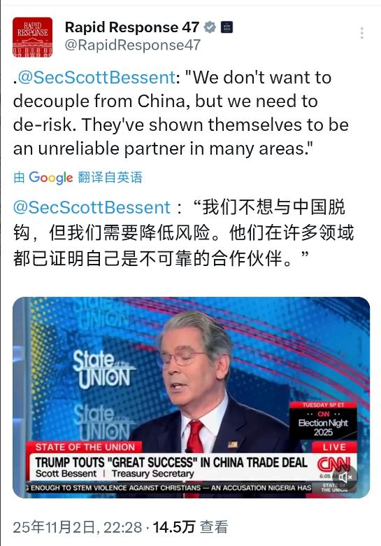 美国财政部长贝森特(北京时间11月2日晚)表示:“我们不想与中国脱钩,但我们需要