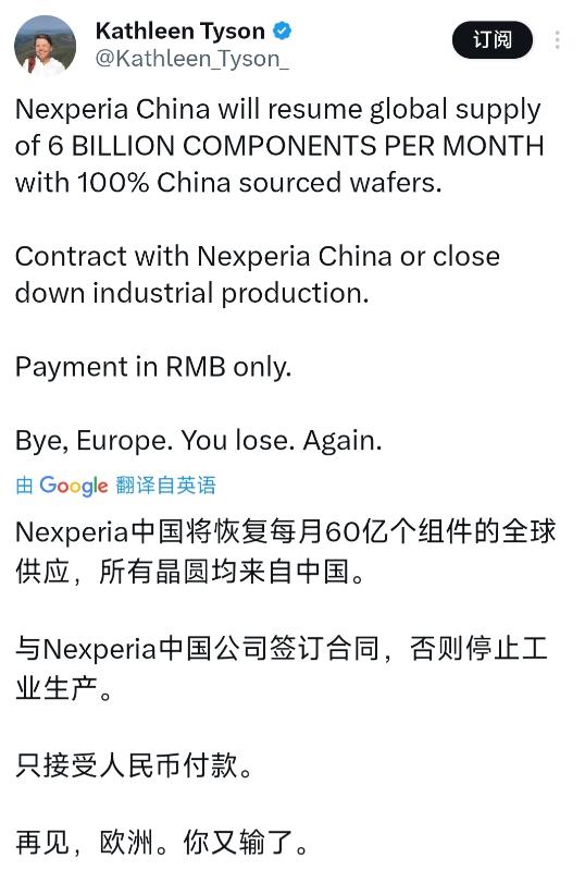 国际金融专家Kathleen Tyson今天(北京时间11月2日)发文写道:“安世中国将恢复每月60亿个组件的全球供应,所有芯片均来自中国。与安世中国公司签订合同,否则停止工业生产。只接受人民币付款。再见,欧洲。你又输了。” 这话听着够冲,可绝非随口乱说,里头藏着中美欧三方的科技博弈,得一点点拆开了说才清楚。 先得讲讲安世半导体这公司的来头。它最早是飞利浦的半导体部门,2016 年从恩智浦拆分出来单干,那会儿日子过得相当憋屈:财务一堆烂账,市场份额还一个劲往下掉,眼看就要撑不下去。 直到 2019 年,中国的闻泰科技出手救了它,前前后后砸了 330 多亿人民币,把这家公司 100% 的股权都买了下来,这可是中国半导体行业史上最大的一笔海外收购。 中资没像有些资本那样只想着吸血,反而真金白银地扶持:把安世的产品接入中国供应链,给稳定的订单,还帮着梳理库存、理顺财务。 就这么折腾了几年,安世不光扭亏为盈,2024 年营收都冲到了 147 亿元,毛利率飙到 37.47%,还挤进了新能源汽车、电网这些高增长领域,中国市场的收入占比快到一半了。 本来眼看着能顺顺当当发展,没想到 2025 年 10 月荷兰政府突然横插一杠子,援引 1952 年的《商品供应法》冻结了安世的资产,直接接管了总部,还把中资在管理层的决策权给剥了精光。 这操作在全球企业并购史上都少见,表面说怕中资影响 “国家安全”,实则就是美欧科技封锁的一环 —— 想切断中国对欧盟中低端芯片市场的掌控,跟美国卡 ASML 出口设备的路子一模一样。 更气人的是,荷兰连一分钱补偿都没提,可他们心里门儿清:安世的工程团队、核心设计能力,还有绝大部分产线全在中国,这根本就是硬生生抢控制权。 荷兰这边刚把总部攥在手里,安世中国那边就拿出了真正的王牌,也就是 Kathleen Tyson 说的 “恢复供应 + 人民币付款”。 安世中国直接宣布,每月 60 亿个组件的供应重启,而且所有芯片全来自中国本土 —— 东莞的封测基地早就扩建完了,上海的晶圆厂 2025 年上半年也满产了,无锡的 12 英寸车规晶圆厂明年初也能投产,现在光中国产线就能稳定输出全球 20% 以上的功率半导体月产能。 更要命的是结算方式:以后不管跟谁做生意,都只收人民币,没得商量。 敢这么硬气,真正的门道在于欧洲根本离不了安世的货。安世做的那些二极管、晶体管,单个卖起来不到一美元,看着不起眼,却是汽车电控系统里缺不了的东西。 全球 40% 的汽车分立器件市场都被它占着,欧洲的大众、宝马这些车企,还有博世、采埃孚这些供应商,早就把安世的货当成了必需品。想换别家的?根本没那么容易。 汽车行业的 AEC-Q 认证标准严得要命,换个料号重新测试验证就得三五个月,短期内根本补不上缺口。 更关键的是,安世中国手里攥着全球 80% 的封测产能,欧洲工厂就算有晶圆,没封测也出不了成品,供应链的命门早被我们掐住了。 这一下欧洲车企彻底慌了神。库存顶多撑几周,一旦断供,车身控制、电源管理这些模块全没法装,生产线就得立马停摆。 之前还喊着要搞本土供应链回流,可分立器件利润薄,建一条产线回报周期得五年往上,现在根本来不及。 对车企来说,停产一天的损失都是天文数字,比起这点汇率成本,保住生产线才是头等大事,只能乖乖接受人民币结算。 Kathleen Tyson 说 “欧洲又输了”,真是一点没说错。这可不单单是被迫认了人民币结算,更丢了市场话语权。 之前欧洲总把 “契约精神” 挂在嘴边,转头就用政治手段砸商业规则,现在终于轮到自己买单了。 而且这事儿的影响远不止于此:全球半导体供应链正从 “全球化” 往 “区域化” 转,中国靠着产能优势,正把人民币结算嵌进产业链的每一环 —— 从稀土到芯片,越来越多的关键产品开始用人民币付钱,这才是真刀真枪的实力翻盘。 可能有人会问,欧洲就不能硬扛着不签?还真不行。2024 年全球半导体销售额都突破 6305 亿美元了,中国占了一大块,安世中国的产能又占全球五分之一。 就算欧洲想找替代,短期内根本没人能接下每月 60 亿个组件的订单。 英飞凌、意法半导体这些厂商的产能都偏高端,低端分立器件的市场早被安世垄断了,小信号 MOSFET、ESD 保护器件这些细分领域,安世的出货量连续好几年都是全球第一。 这跟之前美国大豆的事儿其实是一个道理:美国大豆再丰收,中国不买也白搭;欧洲再喊 “技术自主”,没芯片供应照样停产。 安世中国能这么有底气,靠的不是嘴皮子,是实实在在的产能主权 —— 生产线在中国,封测基地在中国,连芯片原料都能实现国产,这才是谈判桌上最硬的筹码。