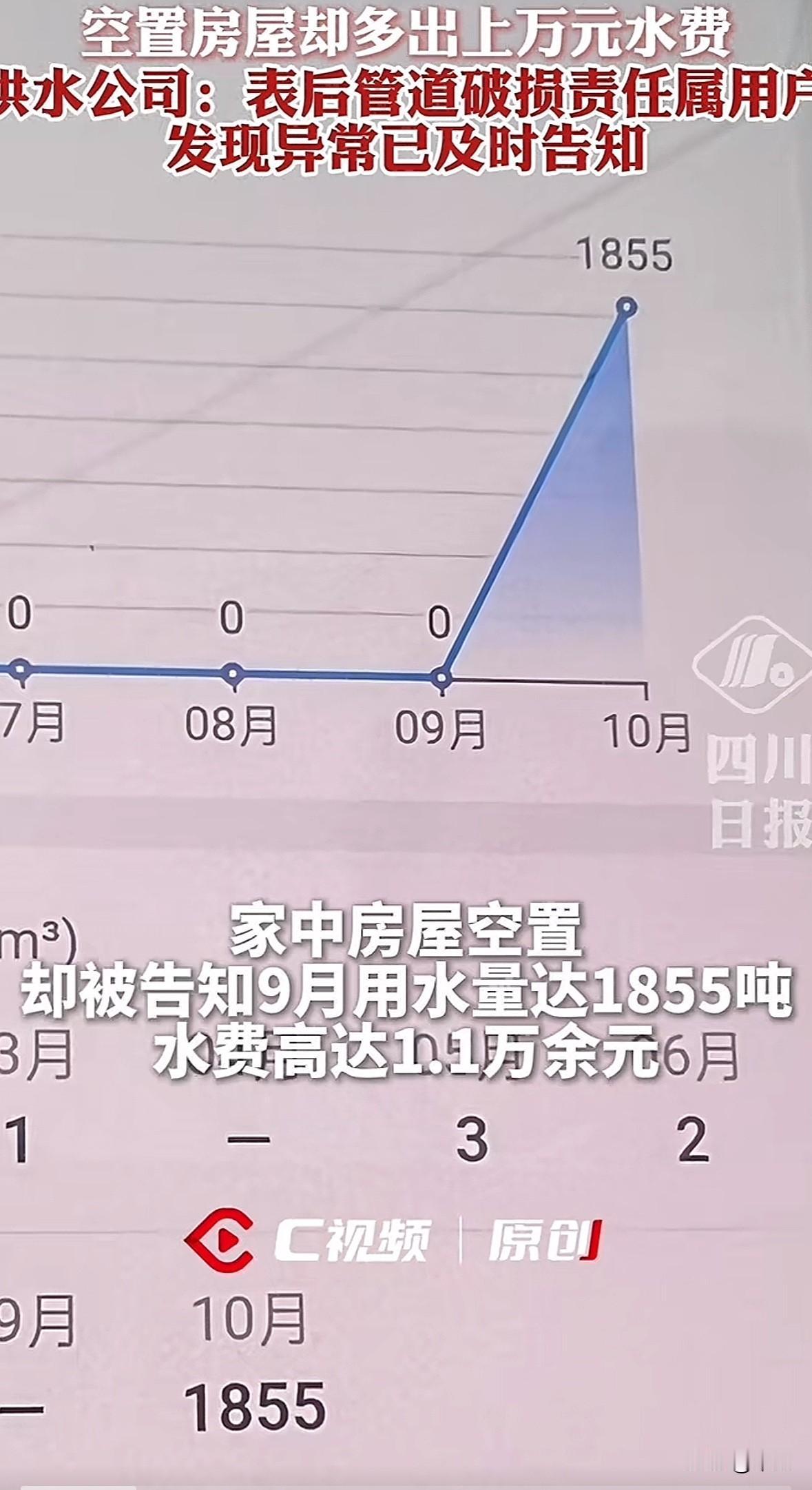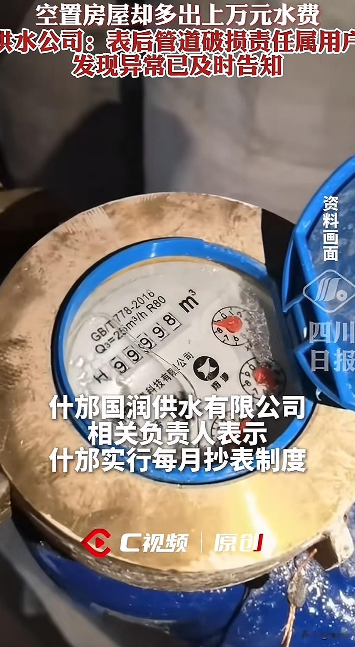 四川德阳什邡两位先生的空置房,9月分别用水1855吨、2176吨,要缴1万多水费。查出来是水表后管道破损,供水公司说这部分该用户负责。 业主觉得委屈,暗管埋在角落根本发现不了,供水公司没及时提醒才造成大损失。法律上确实以水表为界分责任,但供水公司该有异常预警义务。 不少地方水务会提醒空置房关阀或报停,还会动态监测零流量用户。这么大的用水量异常,早发现就能少损失。不能只谈责任划分,供水方的主动提醒和监测也得跟上,毕竟用户没专业检测能力,总不能让大家为看不见的漏损买单。
