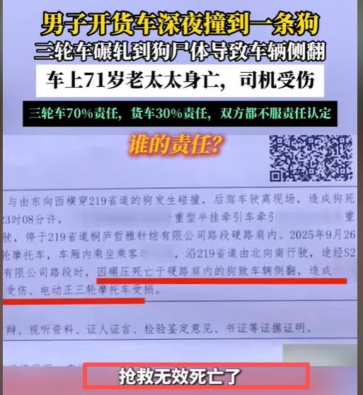 浙江桐庐,一辆货车深夜在省道上行驶时,感觉轧到了什么东西,但司机没有下车检查。谁知一辆电动三轮车路过时也轧到了同一样东西,结果导致车翻人亡。万万没想到,交警竟然认定货车司机是次责,这让货车司机十分不解。 “我明明只是轧到个东西,凭什么要背一条人命?”今年9月的一天晚上,货车司机李先生开车经过了桐庐的219省道上,当时车轮突然传来轻微的震动,他想着可能是块石头,也可能是段树枝,就没有在意。 就在几个小时后,一辆电动三轮车的车轮轧过李先生曾经轧过的那个“东西”时,三轮车瞬间失控侧翻,车上71岁的老太太不幸身亡。而那个引发悲剧的“东西”,是一条被轧死的狗。 事后,交警的事故认定是:电动三轮车驾驶人负70%的责任,而李先生,要负30%责任。 但据后来查看过公共视频的李先生的小舅子说,那只狗是向前爬了二三十米后,在硬路肩上才倒下的。这就意味着,如果狗当场死亡,可能只会被后续车辆避让或轧过;但狗移动后死在硬路肩上,这就形成了一个“意外陷阱”。 硬路肩本是为紧急情况准备的区域,理论上不应有障碍物。所以,李先生这边认为,三轮车驾驶人在凌晨驾车,可能放松了对这个区域的警惕。当他发现狗尸体时,已经来不及避让。一次轻微的碾压,这才引发了车辆侧翻。 那么,问题来了,为什么“无恶意”也要负责?原来,根据规定,驾驶员在发现车辆异常或发生事故时,有义务停车检查并采取相应措施。李先生感觉到轧到东西却未停车检查,导致路面留下了安全隐患。 而三轮车驾驶人的责任在于:作为道路使用者,有义务时刻注意路面情况,确保安全行驶。在能够观察到路面障碍物的情况下未能及时避让,是导致事故的直接原因。 这不是“谁坏谁负责”的道德审判,而是“谁的行为造成风险谁承担责任”的法律逻辑。李先生可能没有主观恶意,但他的行为客观上参与制造了危险。 在生活中,这种“小疏忽”并不少见,开车时随手扔出车窗的矿泉水瓶、阳台上不小心碰落的小物件、施工后未及时清理的建筑材料……它们大多“幸运地”没有造成严重后果,但一旦条件凑齐,就可能演变成悲剧。 李先生之所以不服,是因为这件事打破了人的侥幸心理:“我只是没停车检查”,却要面对如此沉重的后果。 目前,由于李先生和三轮车驾驶人都不认可责任认定,正在走复核程序。但无论最终结果如何,这条逝去的生命已无法挽回。由此可见,开车时多一分留意,遇到不对及时停车检查,这不是小题大做,而是对他人生命安全的尊重,以及避免给自己带来麻烦的必要做法。 信源: 红星新闻2025-10-3——货车司机深夜撞死一只狗,电动车碾压狗尸后侧翻致乘客死亡,交警:电动车驾驶人主责,货车司机次责 文|一阳 编辑|史叔