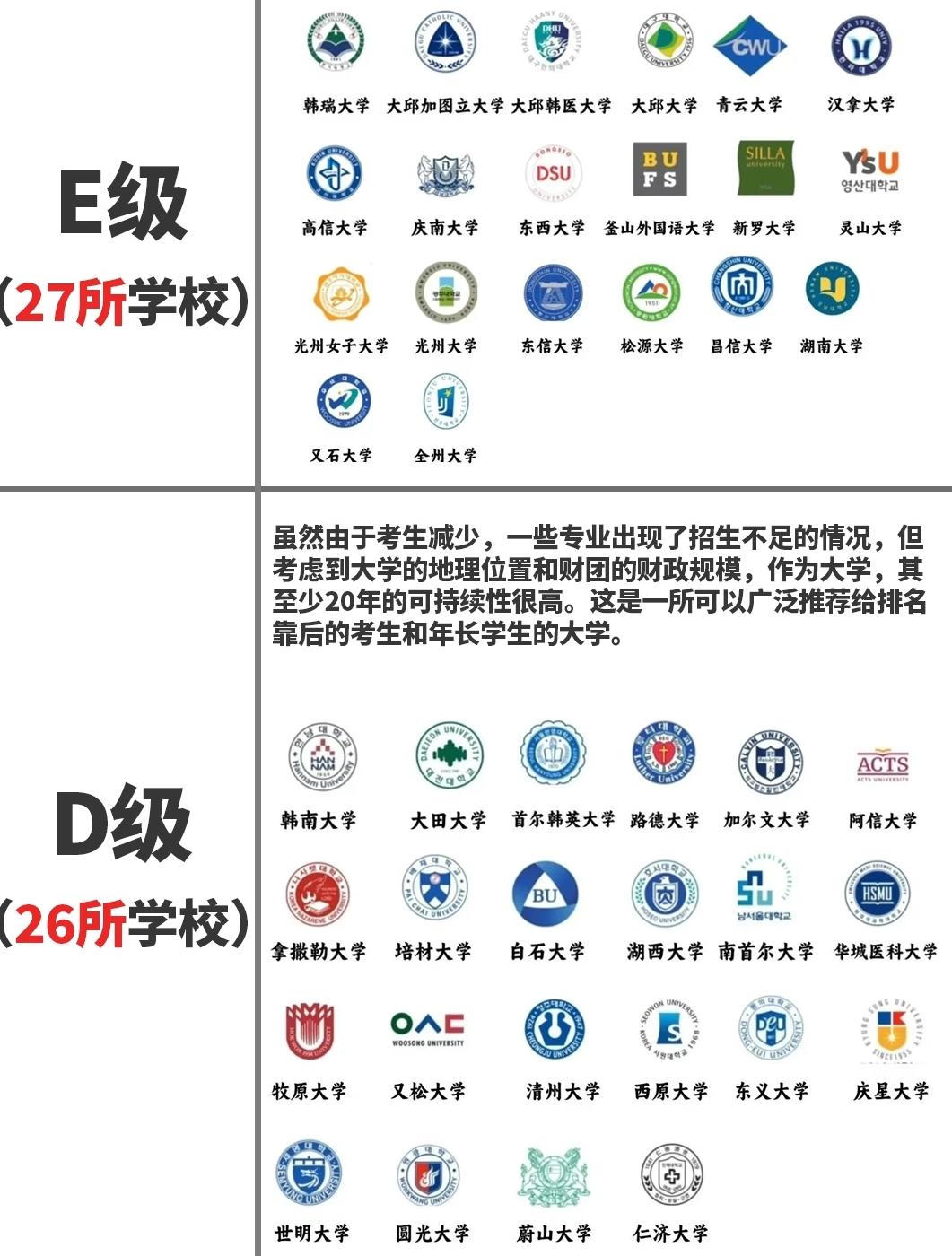 韩国人眼里的大学等级:这些学校的处境,藏着高教的现实 了解韩国留学的人,多半知道当地对大学“等级”的执念——最近看到一份韩国人眼中的大学分级,从F到D级的学校,藏着韩国高教圈的真实困境。 最底端的是F级(6所),定义里写着“除特殊专业外,入学几乎无限制”,甚至标注“存续与否对未来10年的发展意义重大”。像极东大学、金川大学这些,说白了就是招生门槛极低,连基本的入学筛选都弱化了,背后其实是韩国生育率走低、考生减少的现实——学校招不到足够的学生,只能放宽门槛保生存,未来能不能继续办下去都是未知数。 往上的F+级(11所),处境稍微好一点但也没差太多:“几乎无入学限制,未来10年前景不容乐观”。庆云大学、南部大学这些,和F级的区别可能只是专业里还有少数“特殊方向”能卡一下门槛,但整体还是面临招生不足的问题,学校的可持续性已经亮起了红灯。 再往上是E级(27所),评价里提了“考生减少导致部分学科招生不足,但至少10年运营可能性高”,还特意说“适合再教育的返校生”。像加图立关东大学、光州大学这些,胜在没有依赖医学院、药学院这类高成本专业,加上基金会的财政支撑,短期不会消失,但主要受众已经不是应届高考生,而是想“回炉重造”的成年人。 **D级(26所)**算是这几档里相对稳的:“至少20年可持续性高,适合排名靠后的考生和年长学生”。韩南大学、大田大学这些,要么占了地理位置的优势,要么背后财团的财力够厚,即便部分专业招不满,也能靠其他资源撑着,算是韩国“中下游大学”里的“安全选项”。 其实这几档学校的分级,本质是韩国高教“供过于求”的缩影——韩国人口出生率连年走低,高考生数量一年比一年少,但大学数量并没跟着减少,只能靠“降门槛、分等级”来消化资源。对学生来说,进了这些学校,不仅要面对“入学容易毕业难”的压力,毕业后的就业认可度也会打折扣,毕竟韩国企业招聘时,大学等级几乎是“第一道筛子”。 有意思的是,这些学校里也有不少“特色专业”,比如部分艺术、技术类方向,只是被整体的“等级标签”盖过了光芒。但在韩国的社会氛围里,“大学等级”几乎和“个人能力”绑定,很少有人会愿意跳出这个框架看学校。 当一个国家的大学开始靠“放宽门槛”保生存,当学生的选择被“等级标签”框死,这样的高教生态,真的能培养出多元的人才吗?韩国大学层级 韩国本科学校 韩国本科学历 韩国学校 韩国院校排名 韩国大学qs 韩国各区大学