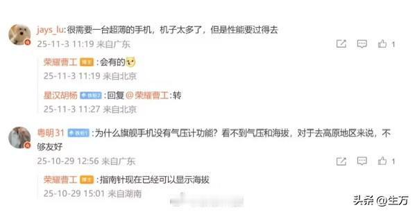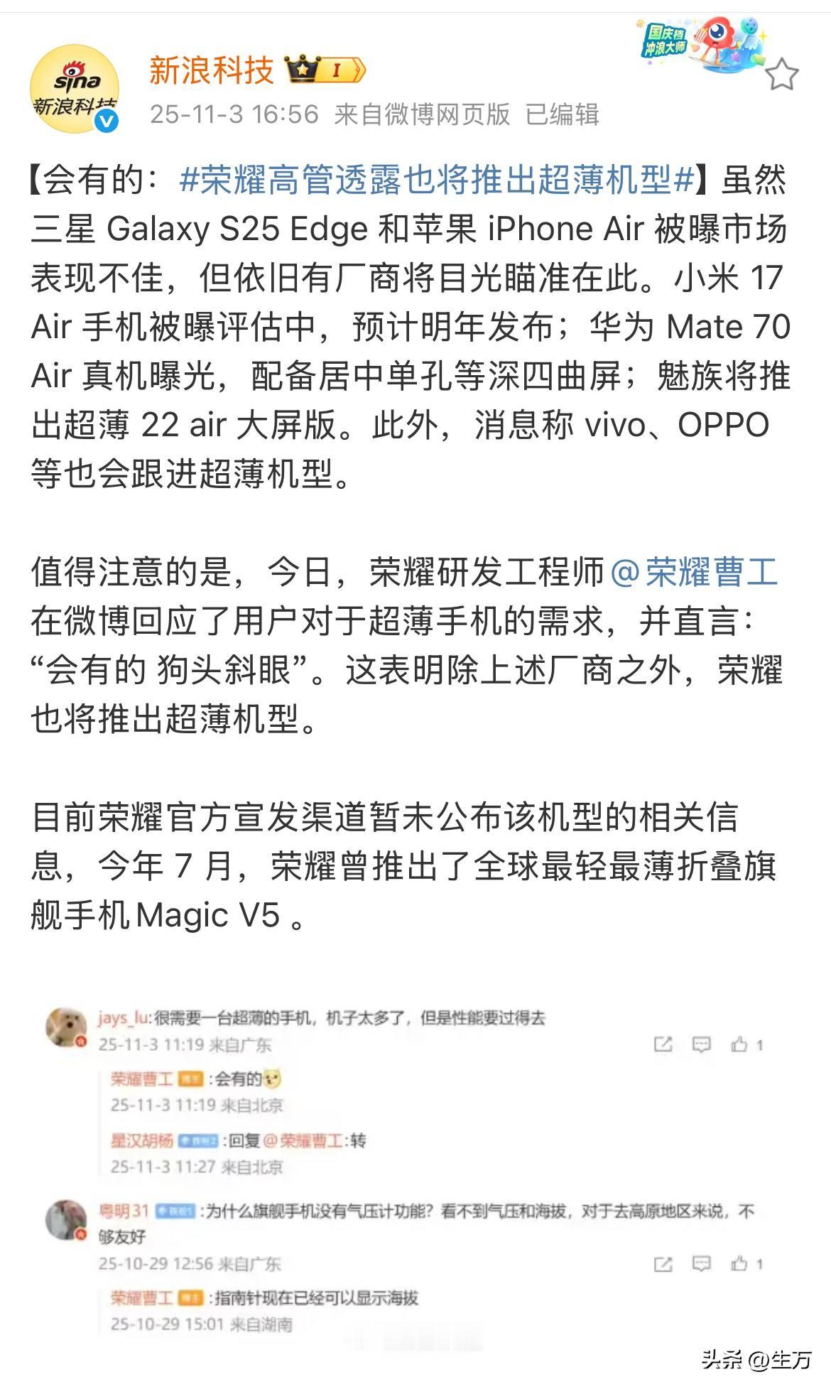 新浪科技:荣耀高管透露也将推出超薄机型! 就在刚才,新浪科技报道了这条消息 这一下轻薄手机市场就更加的热闹了,但目前为止已经知道的,明年要出轻薄的品牌就有好几个了,不管是三星还是苹果,还是我们国产华为等等,这些主流的厂家都会出! 所以既然大家都在做蛋糕,那么荣耀也要来一口,所以有时候时尚和潮流,他就是一个圈圈,虽然苹果证实这个条路好像不怎么走得通! 主要是续航的问题,和性能的问题没有完全跟得上,但是不一定他做不到的,不一定我们国产品牌做不到,所以只要有3+以上加入这个市场,如果其他的品牌不加入,那么就有一种落后被动挨打的局面,因此不管他们主动也好,被动也好,大家都在做这个市场,那么就一定会有一个产品不一样,把上面的毛病都给解决了。 到时候我们看看,谁能够在这个市,做得比苹果还要好。