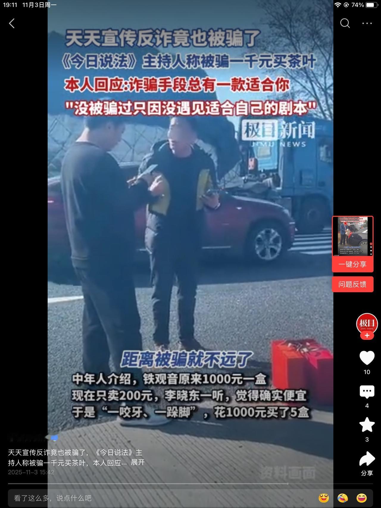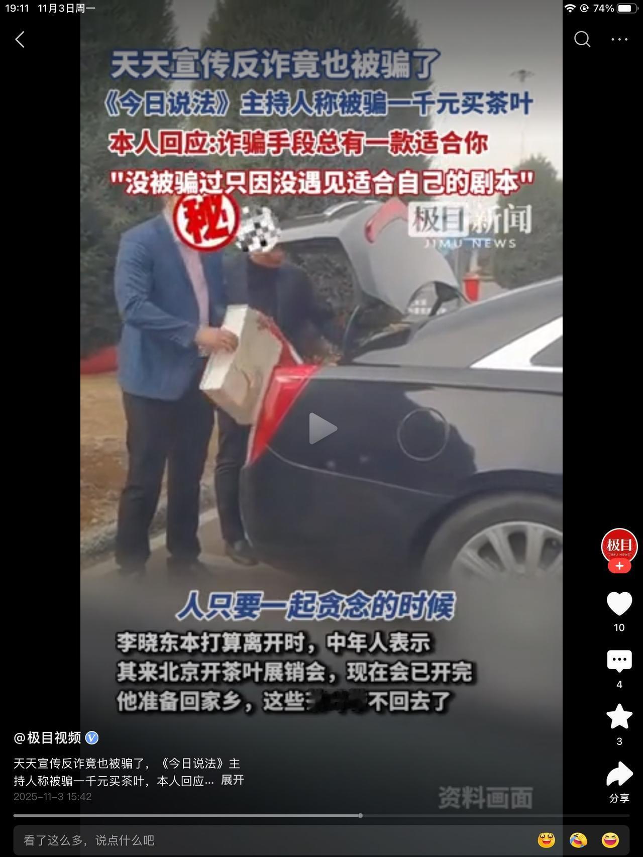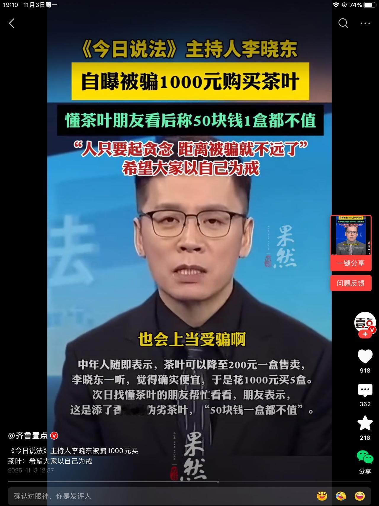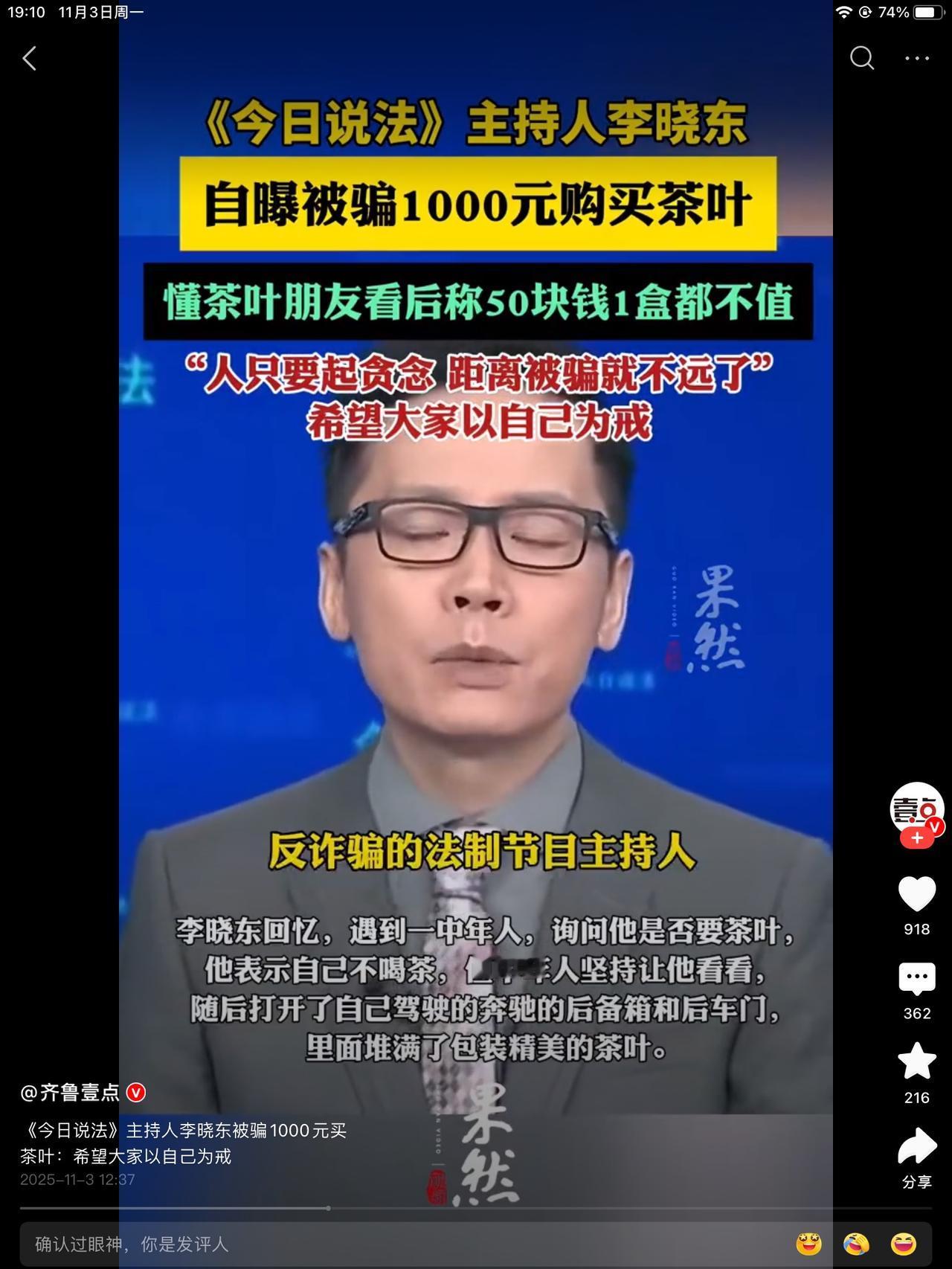 央视主持人,今日说法的还,还是讲法律的,竟然也上当。一千块钱买茶叶,五十块钱都不值。反思以后他说,你只要起了想占便宜的心,就离被骗不远了。 我不知道你们,我每年都花出去点冤枉钱,真的,我觉得人偶尔上一当,其实没什么。总也不上当,神经绷的紧紧的,也离上大当不远了。真的,你仔细想一下。 我身边就有,有句话怎么说的,占小便宜吃大亏。吃点小亏儿抹小灾。人啊,你笑笑我,我笑笑你。你坑坑我,我骗骗你。一辈子,滴水不漏的,身体都不怎么好。你去看。看看就知道了。
