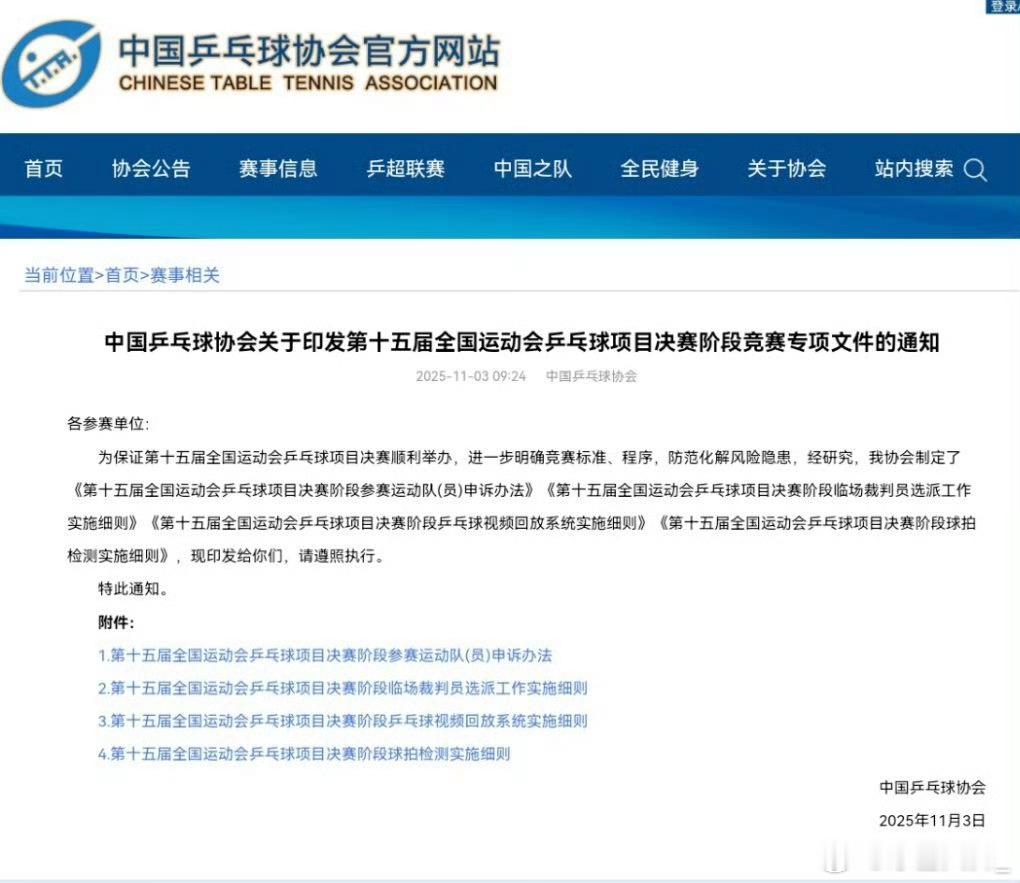 乒协发布关于全运会乒乓球决赛文件中国乒协发布通知:为进一步调动参赛运动员备战第十五届全运会决赛的积极性,保证国家队竞技水平,根据《国家队运动员管理办法》,经协会研究,制定以下条款:一、获得第十五届全国运动会乒乓球决赛(成年组)男子、女子单打前8名的非国家队运动员可入选国家乒乓球队;二、获得第十五届全国运动会乒乓球决赛(青年组)男子、女子单打前2名以及获得男子、女子单打前8名的非国家青年队特殊打法(颗粒胶、直拍、削球)运动员可入选国家青年乒乓球队!