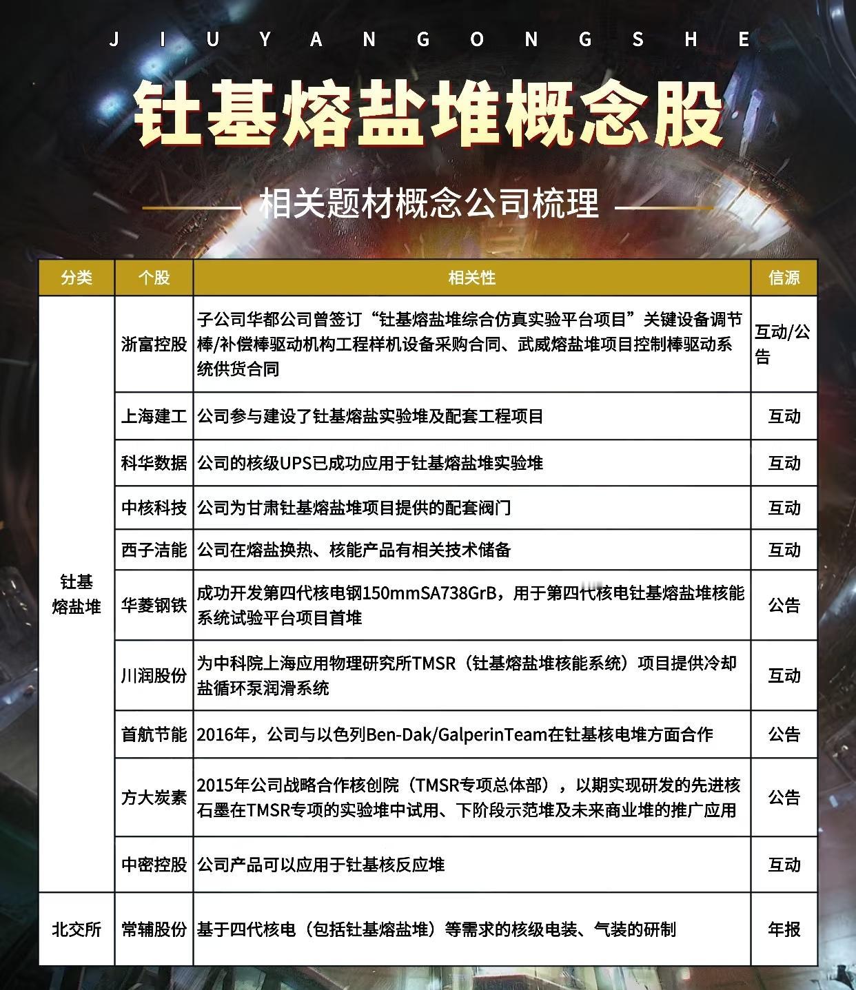 以下是对“钍基熔盐堆概念股”及相关题材概念公司的系统梳理与总结: 一、钍基熔盐堆概念股整体背景 钍基熔盐堆(Thorium-based Molten Salt Reactor, TMSR)属于第四代先进核反应堆技术之一,具有安全性高、核燃料利用率高、核废料少等优势,是中国核能战略发展的重要方向之一。围绕该技术,资本市场涌现出一批与之相关的概念股,主要涉及两大方向: 1. 独居石含钍资源类企业:即拥有或可获取钍元素资源的公司,钍是钍基熔盐堆的主要核燃料。 2. 钍基熔盐堆技术与设备供应商:直接或间接参与钍基熔盐堆相关设备制造、技术研发、工程建设、材料供应的企业。 此外,还有部分北交所上市公司,基于四代核电(含钍基熔盐堆)需求,开展相关特种设备或部件的研制工作。 二、独居石含钍资源相关公司(拥有钍矿资源或处理能力) 这类公司主要通过自有矿产或参股项目,掌握含有钍元素的独居石资源,或具备相关资源的加工、运输、回收能力: - 包钢股份:其拥有的白云鄂博稀土矿为氟碳铈矿与独居石的混合矿,含有丰富的钍资源,钍储量折合二氧化钍达22万吨。信息来源:互动 - 东方锆业:在澳大利亚拥有多个矿产项目(如Image布纳伦项目、Mindarie项目、WIM150项目),这些项目均可产出独居石,其中Image项目年产量可达3000~7500吨独居石。信息来源:互动 - 盛和资源:公司业务涉及独居石,其中含有钍资源;同时参股相关企业(如湖南中核金原新材料),该公司经营范围包含独居石优溶渣处理、钍铀运输回收加工等。全资子公司海南文盛新材也主要生产独居石。信息来源:互动 - 中国核电:通过中核资源(间接参股3.88%)持有独居石等共伴生铀资源综合利用的投资运营平台,为中核集团旗下相关业务的主体之一。信息来源:工商 - 鲁北化工:公司新设立的鲁北钛锆新材料公司,主营业务包括独居石的加工与销售。信息来源:互动 三、钍基熔盐堆技术及设备相关公司(直接参与项目或供应关键设备) 这些公司直接参与钍基熔盐堆相关的技术研发、关键设备制造、材料供应、工程服务,是推动钍基熔盐堆实际落地的重要力量: (一)主要相关企业(来自第一张图和第二张图合并整理) 1. 上海电气:承担了钍基熔盐堆实验堆项目中的关键设备制造,包括堆容器、核热侧主熔盐、二次熔盐换热装置等,属于四代试验堆核心装备供应商。信息来源:互动 2. 宝色股份:参与中科院上海应物所“钍基熔盐堆综合仿真实验平台项目”,负责主容器、堆内支撑装置等关键部件的加工制造。信息来源:互动 3. 海陆重工:其核电设备供应范围包括四代堆型(如钍基熔盐堆),曾为2MWt液态燃料钍基熔盐实验堆承制余热排出系统的关键换热装置。信息来源:互动 4. 兰石重装:在钍基熔盐堆技术领域拥有丰富的技术储备,参与过第四代新型反应堆(包括钍基熔盐堆)的关键装备研发,以及核乏燃料后处理相关装备的研究。信息来源:公告 5. 浙富控股:子公司华都公司签订了“钍基熔盐堆综合仿真实验平台项目”的关键设备合同,包括调节棒/补偿棒驱动机构工程样机,以及武威熔盐堆项目的控制棒驱动系统供货合同。信息来源:互动/公告 6. 上海建工:参与了钍基熔盐实验堆及配套工程的建设工作。信息来源:互动 7. 科华数据:其核级UPS电源产品已成功应用于钍基熔盐堆实验堆,为相关设施提供电力保障。信息来源:互动 8. 中核科技:为甘肃钍基熔盐堆项目提供了项目所需的配套阀门。信息来源:互动 9. 西子洁能:在熔盐换热技术、核能相关产品领域具备一定的技术储备,与熔盐堆应用场景相关。信息来源:互动 10. 华菱钢铁:成功研发并供应了第四代核电用钢——150mm厚的SA738GrB钢材,该材料被用于钍基熔盐堆核能系统试验平台的首堆项目。信息来源:公告 11. 川润股份:为中科院上海应用物理研究所的TMSR(钍基熔盐堆核能系统)项目,提供了冷却盐循环泵的润滑系统。信息来源:互动 12. 首航节能:2016年曾与以色列团队(Ben-Dak/Galperin Team)在钍基核电堆方面展开合作。信息来源:公告 13. 方大炭素:2015年与核创院(TMSR专项总体部)达成战略合作,旨在推动其研发的先进核石墨材料在钍基熔盐堆实验堆中的试用,并计划推广至示范堆及未来商业堆。信息来源:公告 14. 中密控股:公司生产的密封类产品可应用于钍基核反应堆,具备相关场景适配能力。信息来源:互动 (二)北交所相关企业 - 常辅股份:作为北交所上市企业,其基于四代核电(包括钍基熔盐堆)的需求,开展了核级电装、气装等关键部件的研制工作。