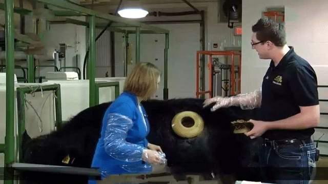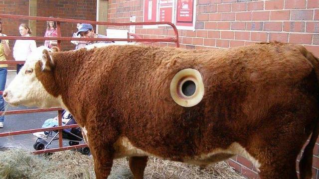 在美国有一个非常奇怪的现象,你会发现几乎每一只牛身上都开着一个“洞”不理解,偶尔还能看见人伸手进去掏东西,可牛居然照样低头啃草,半点痛苦模样都没有。 要知道美国畜牧业向来标榜 “科学养殖”,总不能干既缺德又赔本的买卖吧?这看似惊悚的 “穿孔术”,实则藏着养牛业的生存智慧。 牛是天生的 “素食加工大师”,四个胃室分工明确,最关键的瘤胃相当于巨型发酵车间,里面几十万亿微生物日夜忙活,把干草里难消化的纤维拆成营养。 可圈养跟野外截然不同,饲料多是玉米、豆粕混合的精粮,牛吃太快又没地方溜达,微生物军团很容易 “罢工”。 要么胀气鼓得像皮球,要么酸度过高烧胃,轻则掉几十斤肉,重则几天内就死了。早年牧场主只能眼睁睁看着牛病死,直到 “瘤胃瘘管术” 出现才解了燃眉之急。 这办法可不是瞎琢磨出来的,早在上世纪初就被兽医发明,如今美国农业部还专门制定了操作规范,不是随便哪个牧场都能做。手术得全麻,切口选在瘤胃最膨隆的位置,缝上特制橡胶瘘管,愈合后就成了 “观察窗”。 遇到牛胀气,打开盖子就能放气;酸度过高就直接灌小苏打,比等牛发病再打针吃药管用多了。有数据显示,做了瘘管的牛群,消化系统疾病发病率能降 60%,产奶量还能涨 10%。 这洞的本事还不止治病。遇到别的牛瘤胃失调,直接从 “健康牛” 的瘘管里取点胃液灌进去,相当于给病牛的微生物军团 “增兵”,比打针吃药管用多了,成活率能从 30% 提到 80%。 有牧场主算过账,一头牛做手术要花几百美元,但能多产奶、少生病,出栏时能多赚上千美元,这笔买卖太值了。 更关键的是,这洞还是个 “科研接口”。大学和饲料公司早就盯上了这些 “带洞牛”,通过洞口取样本测酸碱度、微生物种类,能精准算出哪种饲料配方长得快又健康。 比如近年流行的环保饲料,就是靠它们试吃,找出能减少甲烷排放又不影响增重的配比,现在美国不少牧场用的饲料配方,都带着这些牛的 “功劳”。甚至有研究机构靠瘘管观察,发现牛在不同季节对饲料的需求差异,帮牧场省下了近 20% 的饲料成本。 有人骂这是虐待动物,早年法国动物保护组织还拍过视频声讨,但美国兽医协会的实验戳破了谣言:手术全程全麻,愈合后监测显示,牛的疼痛感、活动量和正常牛没差别,反而因为消化顺畅,采食时间多了 20%。 而且平时洞口有螺旋密封盖,下雨不进水,蚊虫也钻不进去,根本不影响牛的正常生活,连美国动物福利协会都认可这是 “必要的治疗性操作”。 现在虽有物联网胶囊能监测瘤胃状态,但牧场主更认瘘管术。胶囊要定期更换,数据还可能受信号干扰,瘘管一次手术能用好几年,伸手就能取样,发现问题当场处理,比高科技更接地气。 美国最大的肉牛养殖集团泰森食品就公开说,旗下千头以上的牧场都有 “瘘管牛”,这是控制疫病、保证出栏率的 “标配”。 这么一看,牛身上的洞哪里是怪异行径,分明是美国畜牧业的 “生存密码”。从治病救牛到优化饲料,再到降低养殖成本,这小小的瘘管藏着农业工业化的大智慧。那些觉得惊悚的人,大概是没见过牧场主看着健康牛群时的踏实。 毕竟在养殖行业,能让牛活得更久、产出更高的办法,再看起来奇怪也会被奉为圭臬。说到底,这洞照出的不是残忍,而是人类跟牲畜相处时,最实在的科学逻辑。