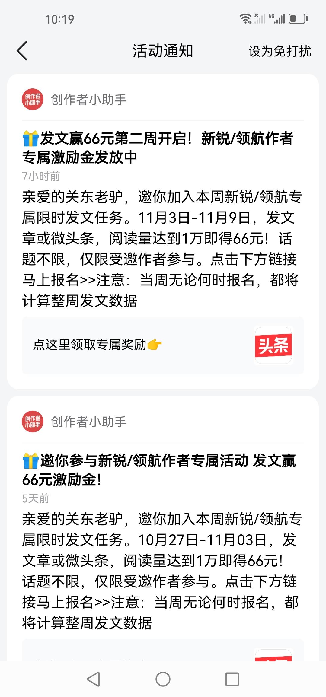 今天下午,我收到了头条发来的第二周发文奖励邀请。尽管这两天流量不佳,我还是果断报名了! 上一周的发文奖励活动,我的文章阅读量超一万次,顺利完成了目标。这一周,又是一个全新的开始。虽说近两天阅读量很不理想,但我依旧信心满满。我喜欢这种充满挑战的活动,它能激发我的潜力,为我指明目标与方向,让我得以全力以赴。我相信,只要肯努力,就一定能达成目标。 实际上,这次活动的要求并不高,一周累计一万次阅读量。放在以前,认真写一篇文章就能轻松搞定。然而这段时间流量确实不太好,或许是我自身存在问题,我还得好好去学习,改正自身的不足,提升写作能力,这才是长久之策! 第二周发文奖励活动已然开启,我会全力以赴完成目标,也希望大家都能达成目标! 你们报名了吗?感兴趣的朋友可以在评论区交流交流。
