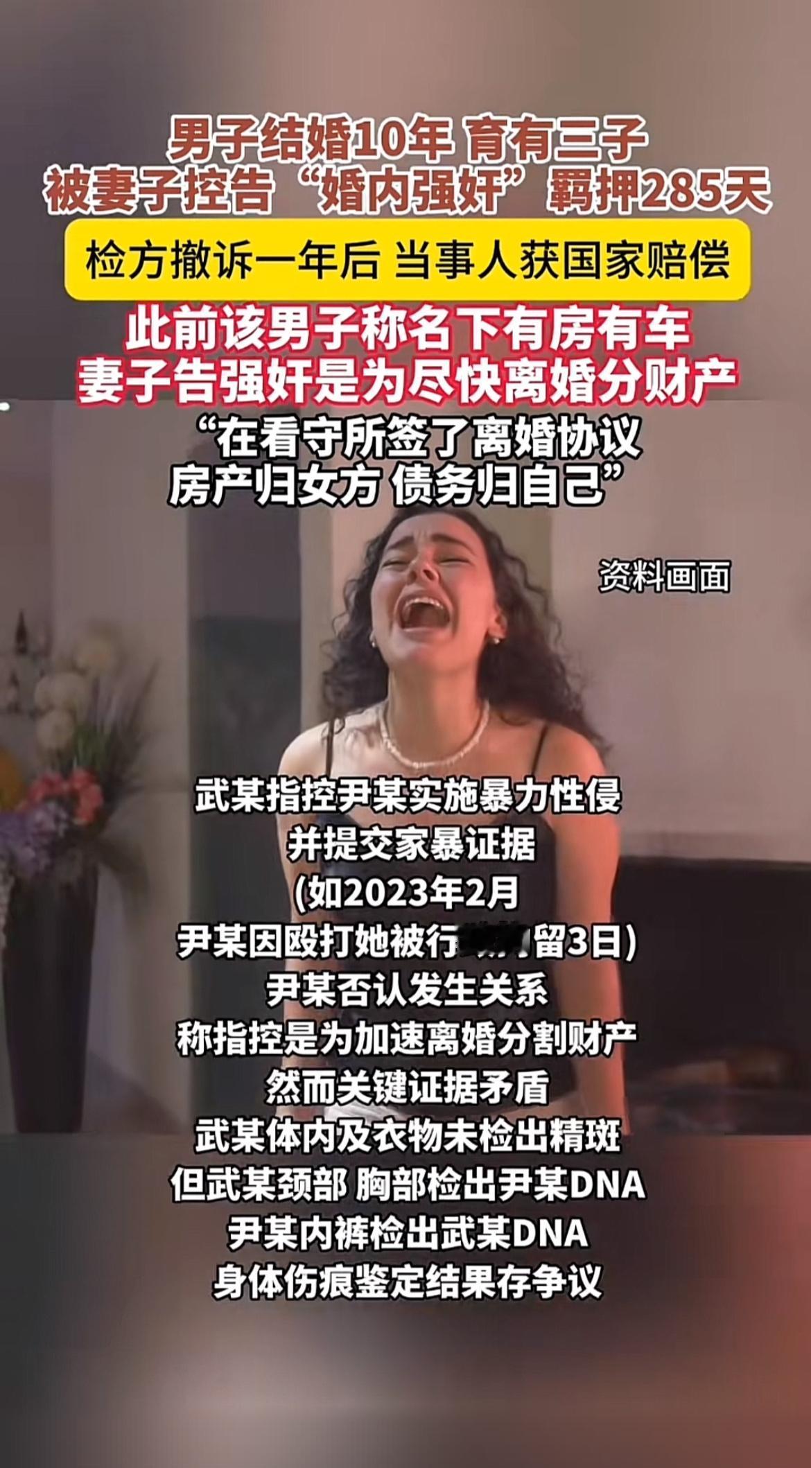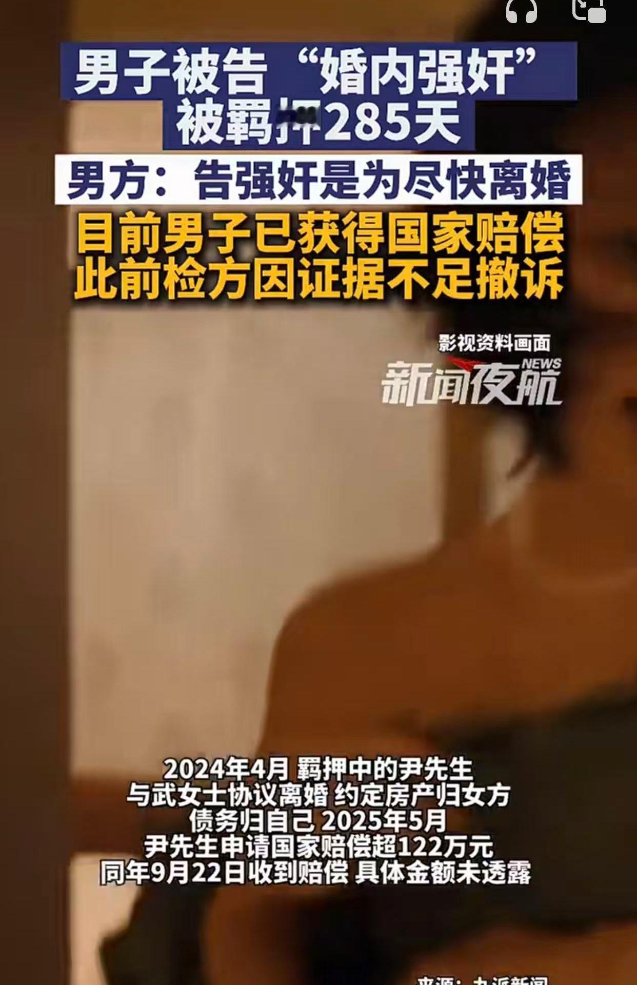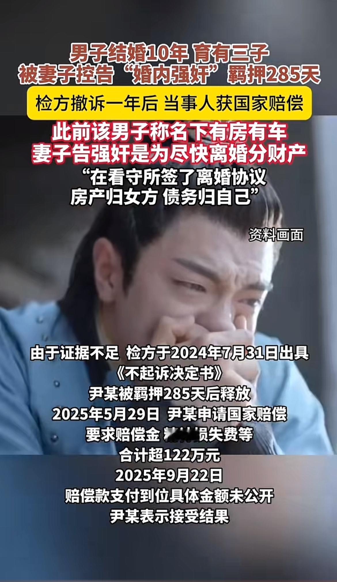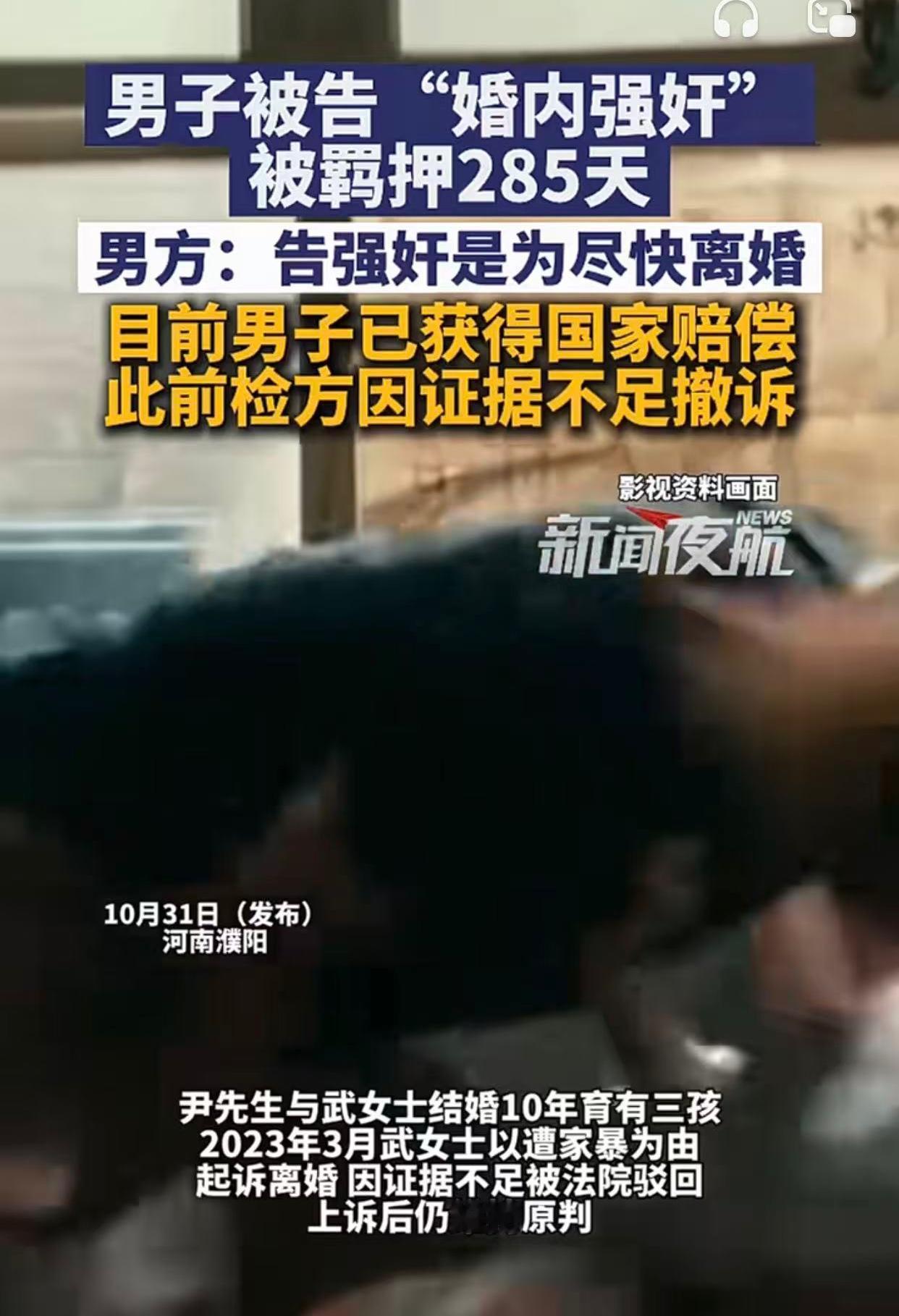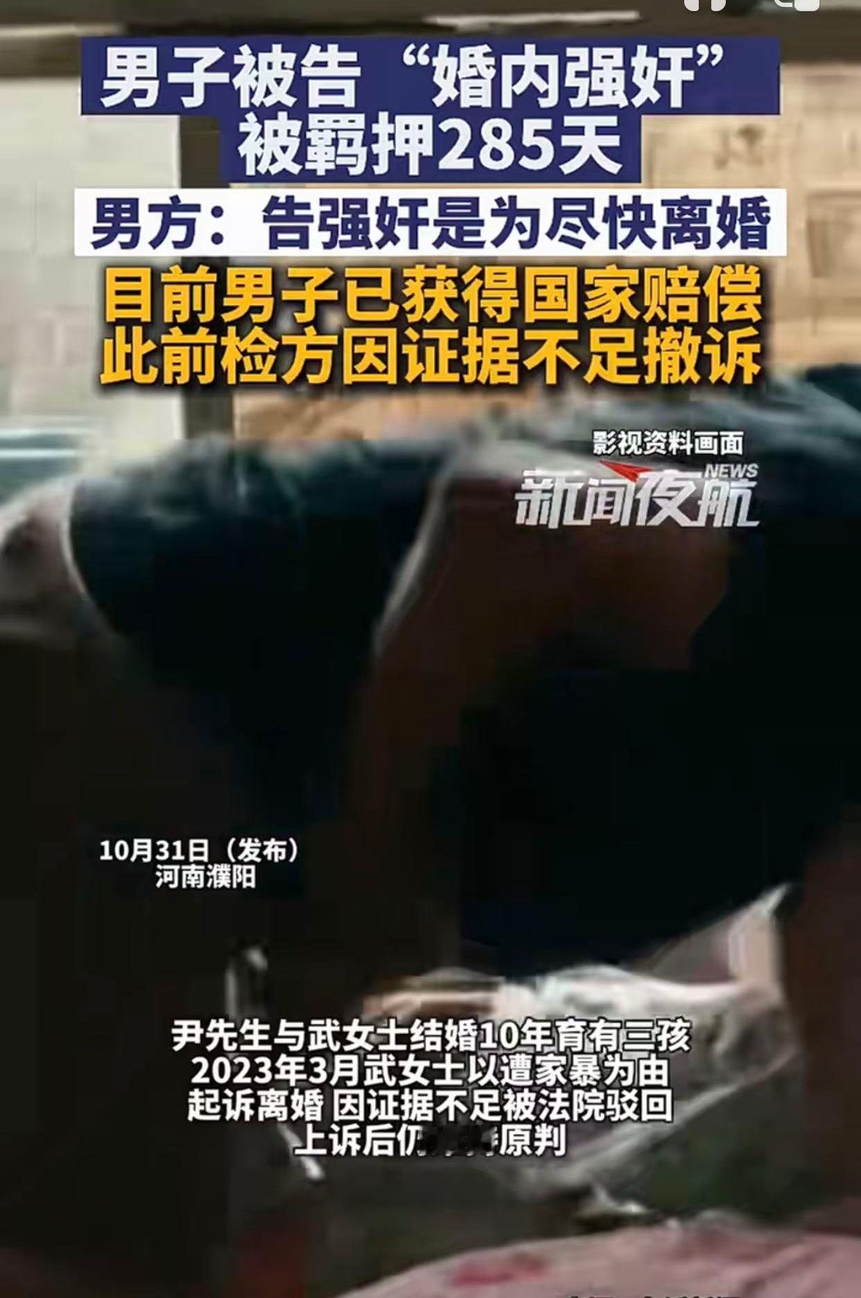 “十年婚姻,终成冤狱”,被妻子控告婚内强奸现实中真有这样的例子。河南濮阳尹某和妻子武女士结婚十年,育有三个孩子。2023年女方提离婚,法院两次不准离后,女方报案称被尹某强奸。尹某因此被关285天,女方称其家暴、强奸,可关键证据精斑却未查到。检察院最终因证据不足撤诉。尹某出来签了离婚协议,却觉得被糊弄。最后他拿到国家赔偿,此事才算有了个结果。这十年婚姻,从最初的结合到后来的纷争,从离婚纠纷演变成刑事案件,实在让人唏嘘,“冤狱”二字道尽了其中的无奈与曲折。