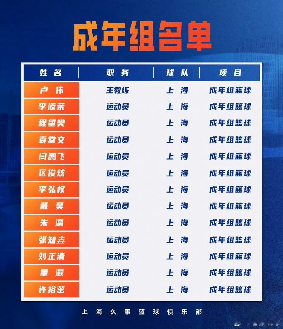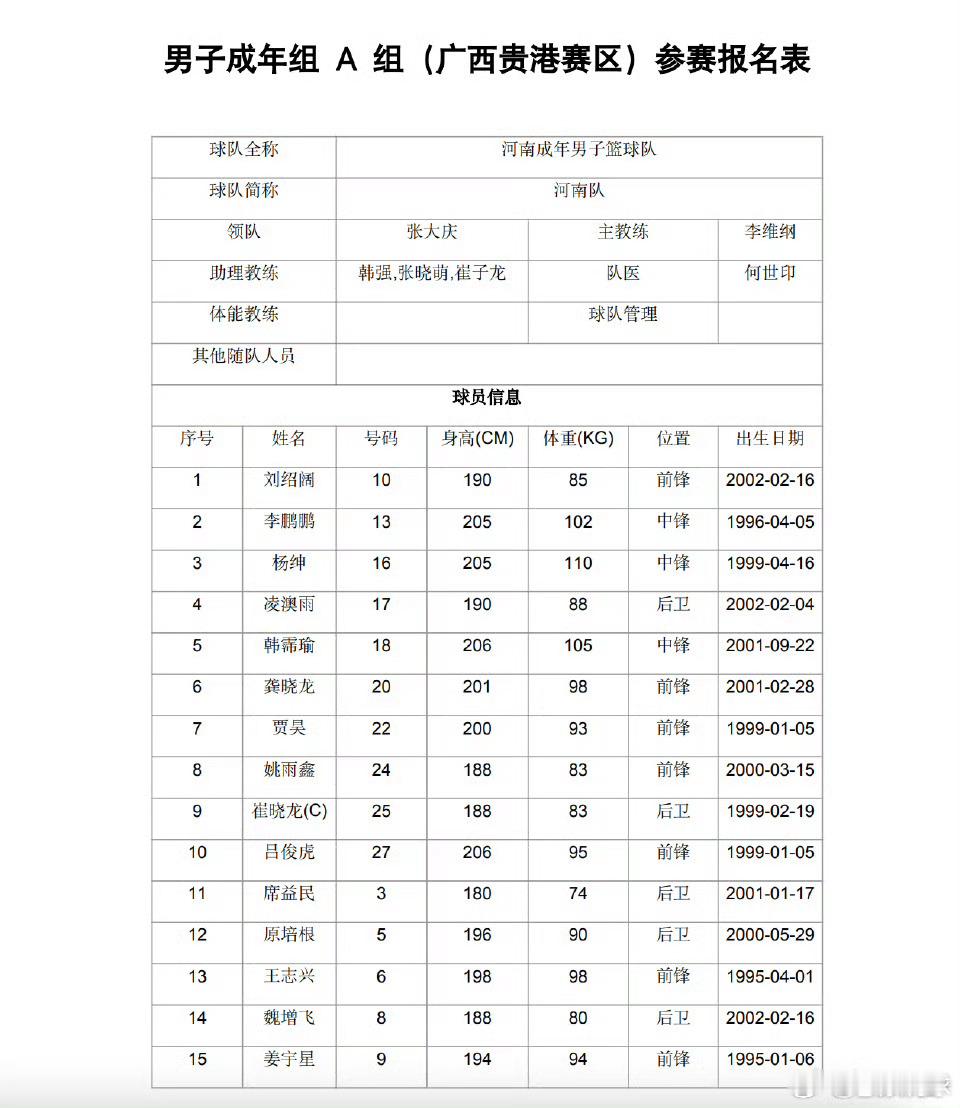 河南成年最终出战名单,还需要看比赛时的临场名单。这份名单是报名时的大名单。