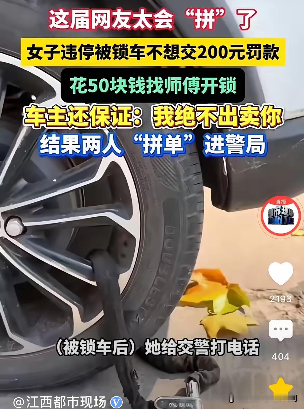 河南许昌,女子违停被交警上锁,罚款200元。女子不想交钱,花了50块钱联系开锁师傅帮忙。起初开锁师傅还有些犹豫,女子便承诺,绝不会出卖你。结果悲剧了,俩人“拼单”进了警局。 网友评论: 个人疑问:自行车停路边算违停,那么城市路边停得乱七八糟的共享单车算不算违停呢? 琐车罚款能解决问题吗?只能让道路更堵,她也是无奈之举,车位有他就不会乱停了,这是设计不够的问题,有关部门没有责任吗? 强制措施中没有“锁车”一说,只有经通知后仍不驶离的“强制拖车〞。 没有见过锁车的,我车都是拍照短信通知,违章停车罚款200。照片拍得好清楚,现在高清摄像头还真不是闹着玩的。 不关开锁人员事!为了转钱!那里有活那里去!