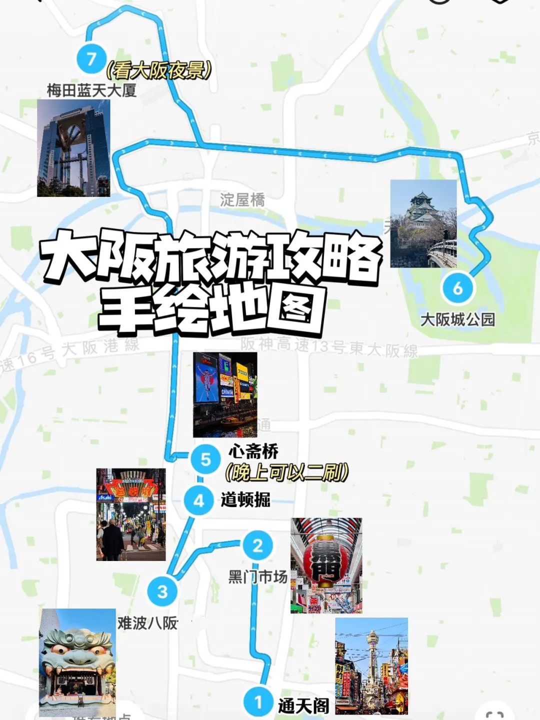 通天阁➡️黑门市场➡️道顿堀➡️难波八阪➡️心斋桥➡️大阪城公园➡️梅田蓝天大厦(看大阪夜景)