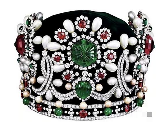 王冠是有祖母绿、鸽血红宝石、珍珠和钻石搭配而成。