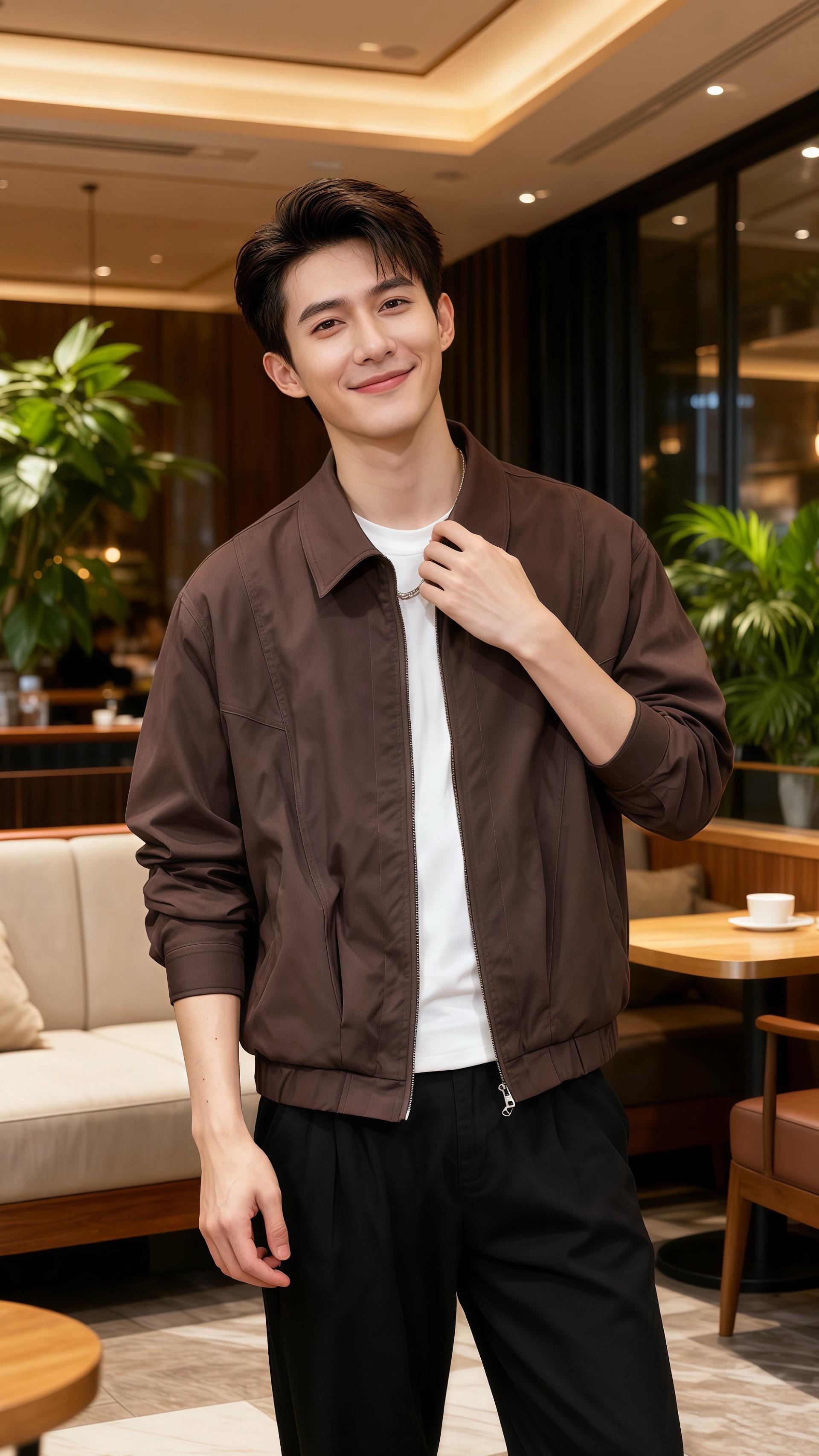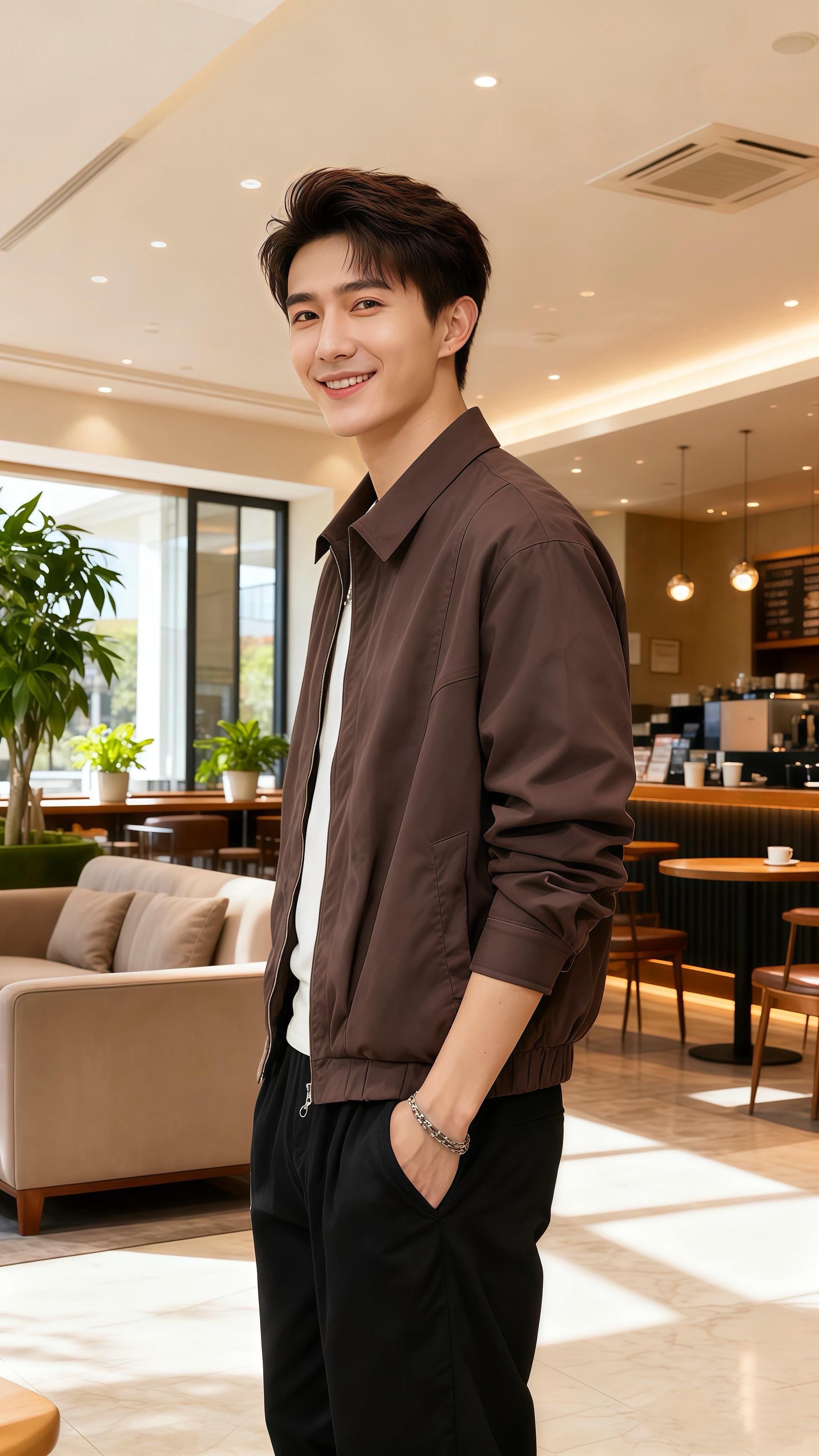 午后的咖啡厅里,许妍推门时撞进皓明的目光里。 他穿那件深棕夹克,松松垮垮裹着肩线,配白T和黑裤,像把秋日的温软揉进了衣料里。许妍落坐时指尖碰了碰他的咖啡杯:“你今天这身……看着很舒服。” 皓明指尖蜷了蜷杂志页,笑出浅梨涡:“早上挑了半小时,猜你会喜欢这种不扎眼的调调。” 阳光浸在他袖口褶皱里,许妍搅着咖啡,忽然觉得,好的穿搭大抵是这样——衬得人温软,也衬得心跳都轻缓。