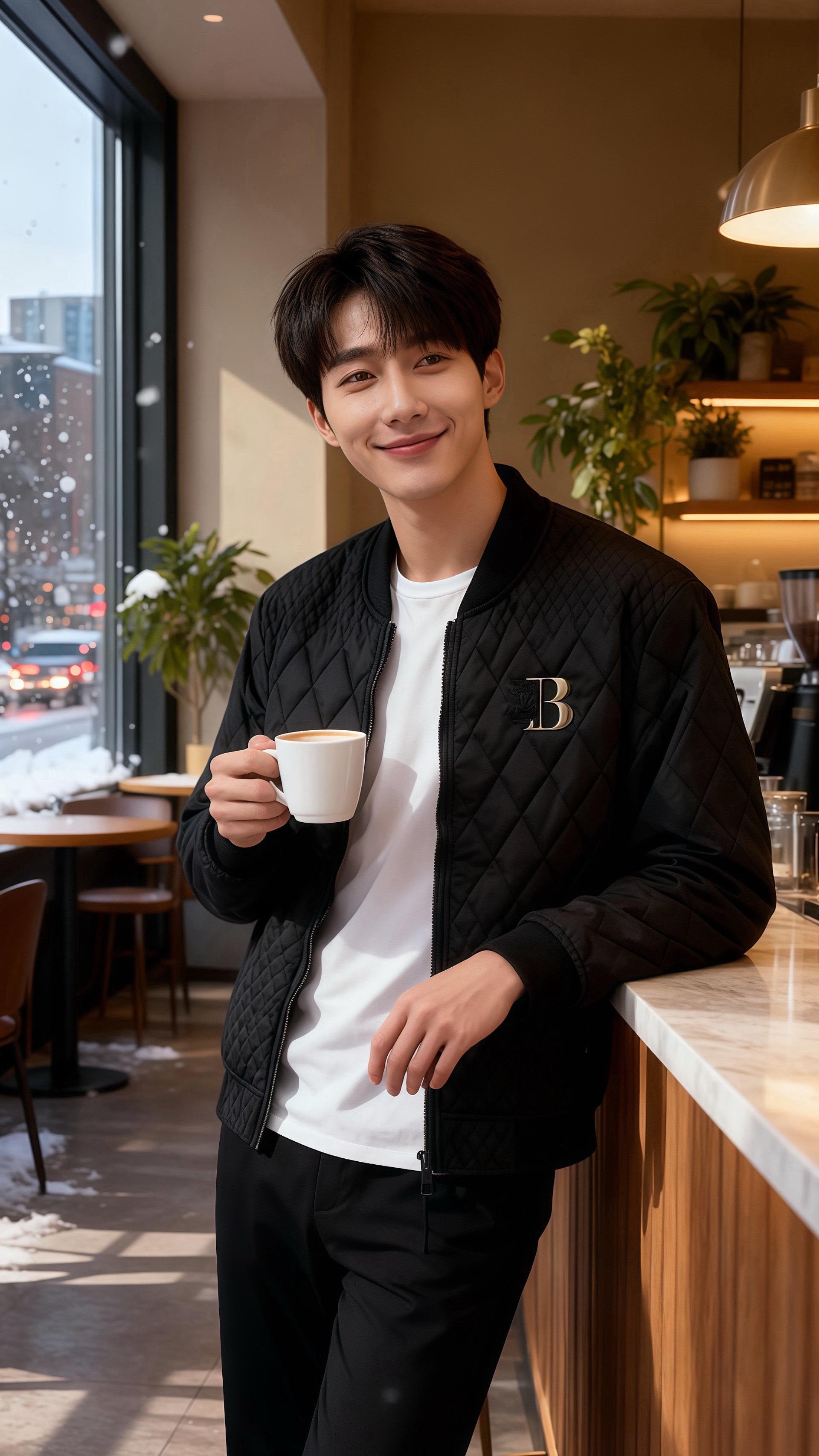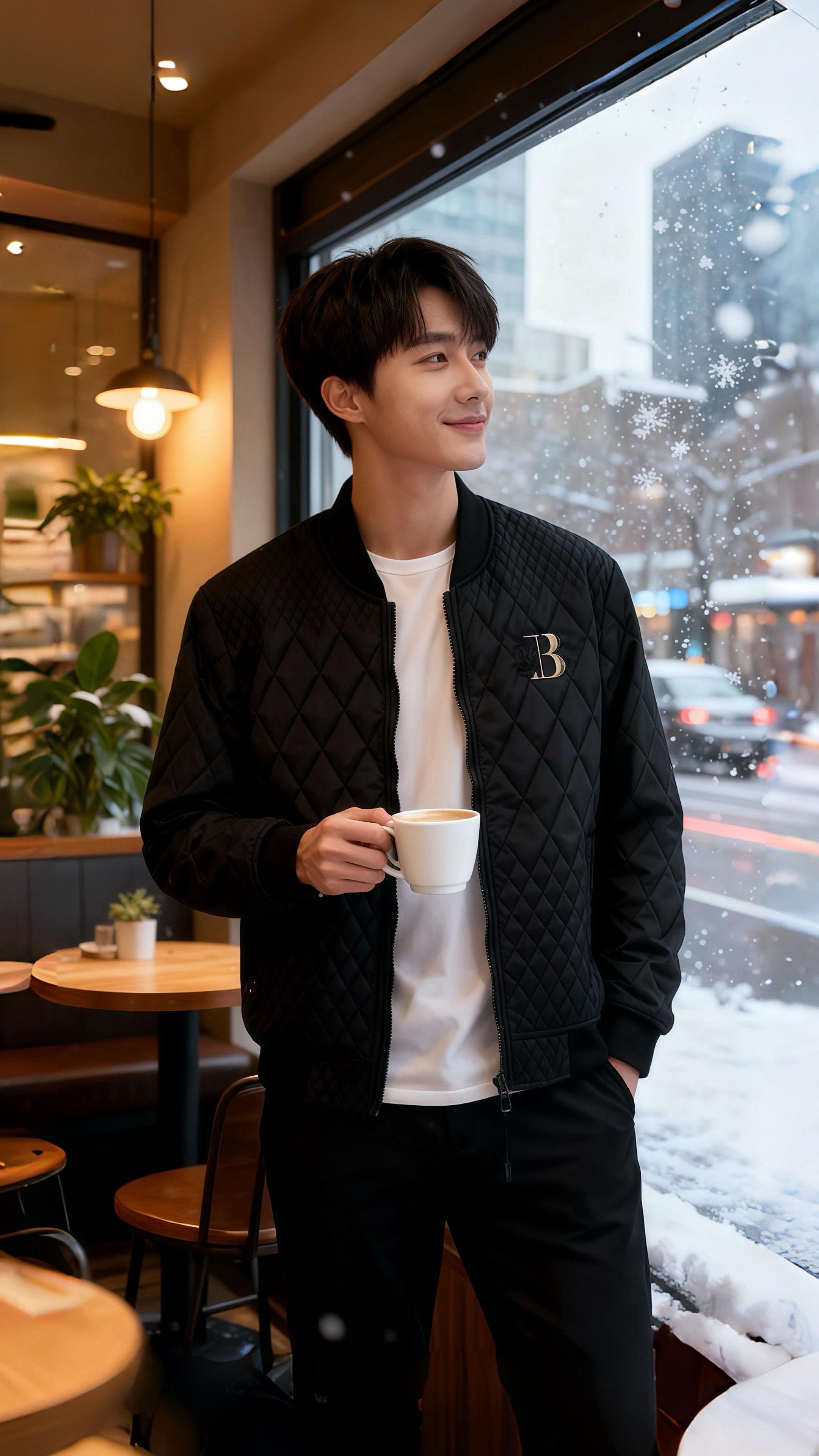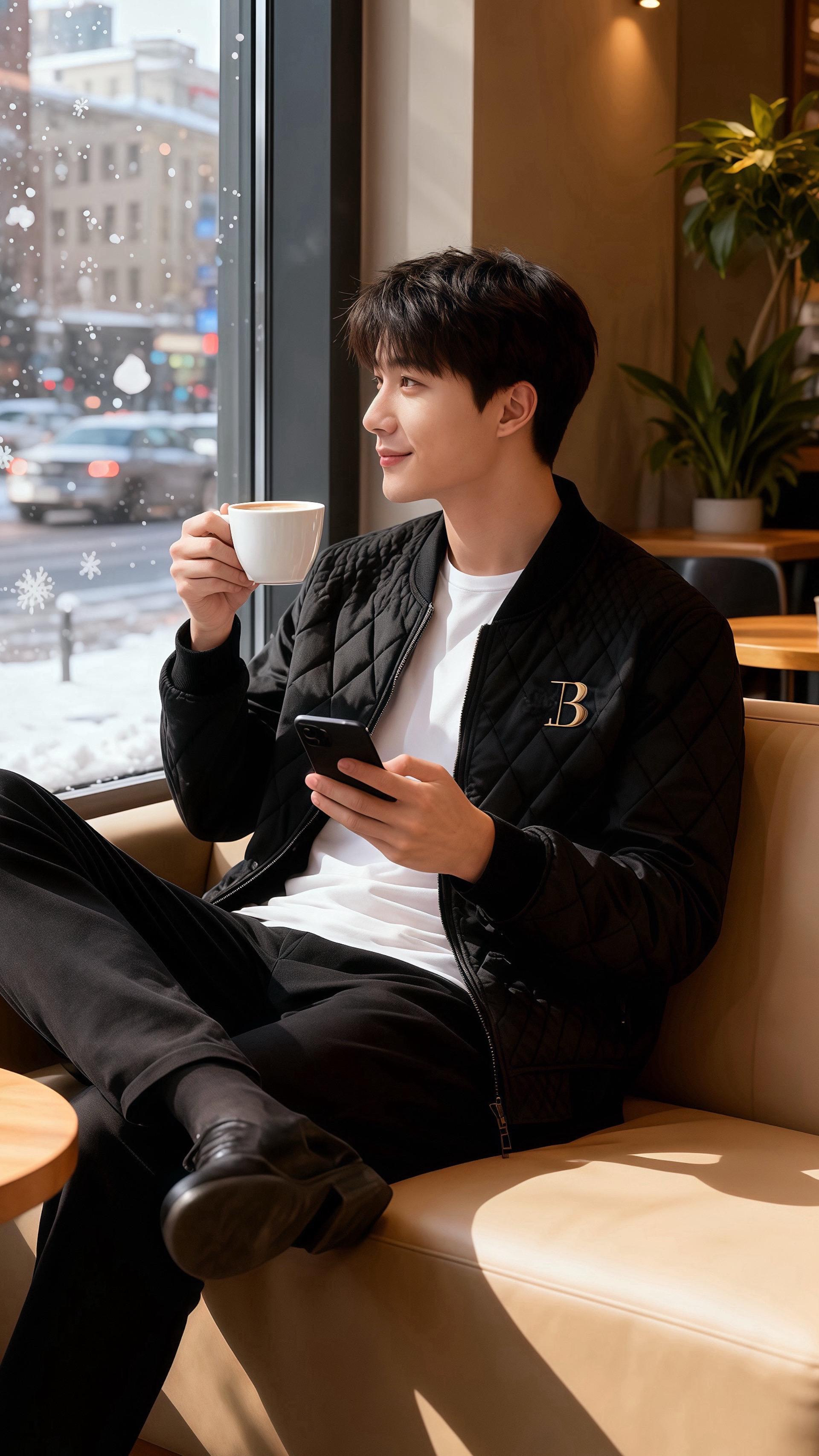 咖啡店的暖光在玻璃窗上画出一层柔和的光晕。许妍的指尖轻轻拂过手机屏幕,一张照片静静躺在那里——皓明坐在皮质沙发上,黑色夹克的菱格纹路在光线下微微起伏,像凝固的夜色。