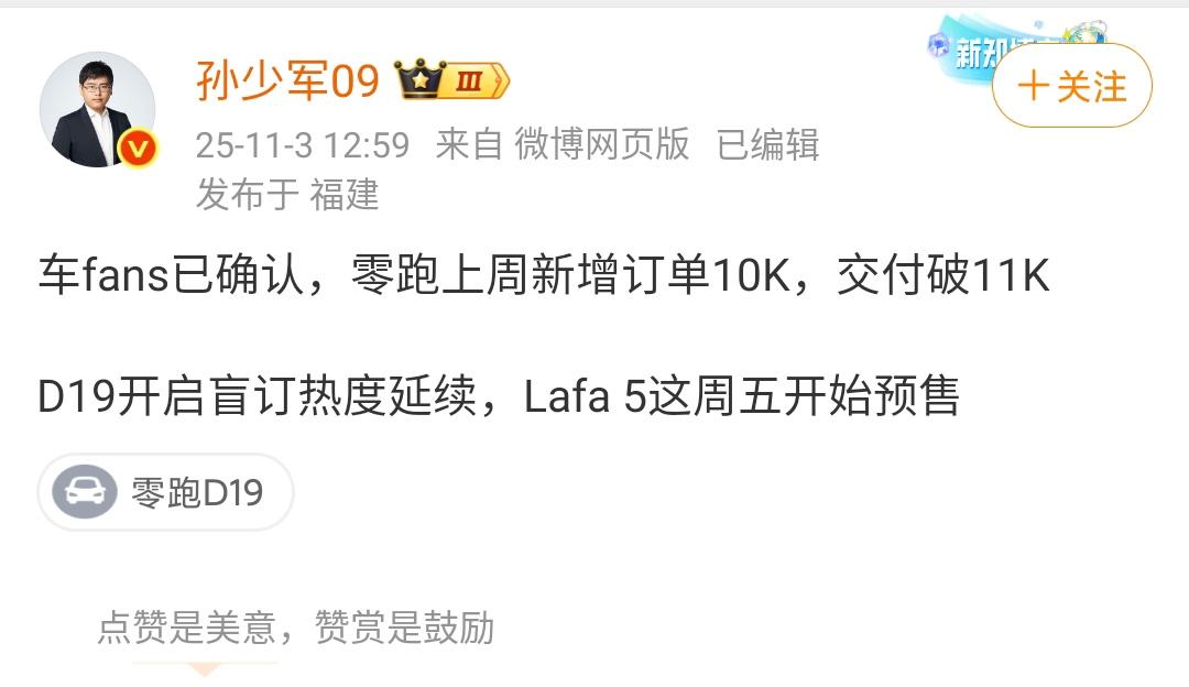 孙少军:零跑上周新增订单突破1万! 交付量更是突破了13,000台,零跑汽车现在越来越热销,到年底有没有机会突破9万辆的成绩? 相信应该是有机会的,毕竟还有两款产品将上线,而且零跑汽车现在的销量确实是越来越高,知名度也是越来越的越大。 上个月销量已经到了7万多辆,这已经超过了很多传统车企的销量了。各位是怎么看的?欢迎评论区留言。