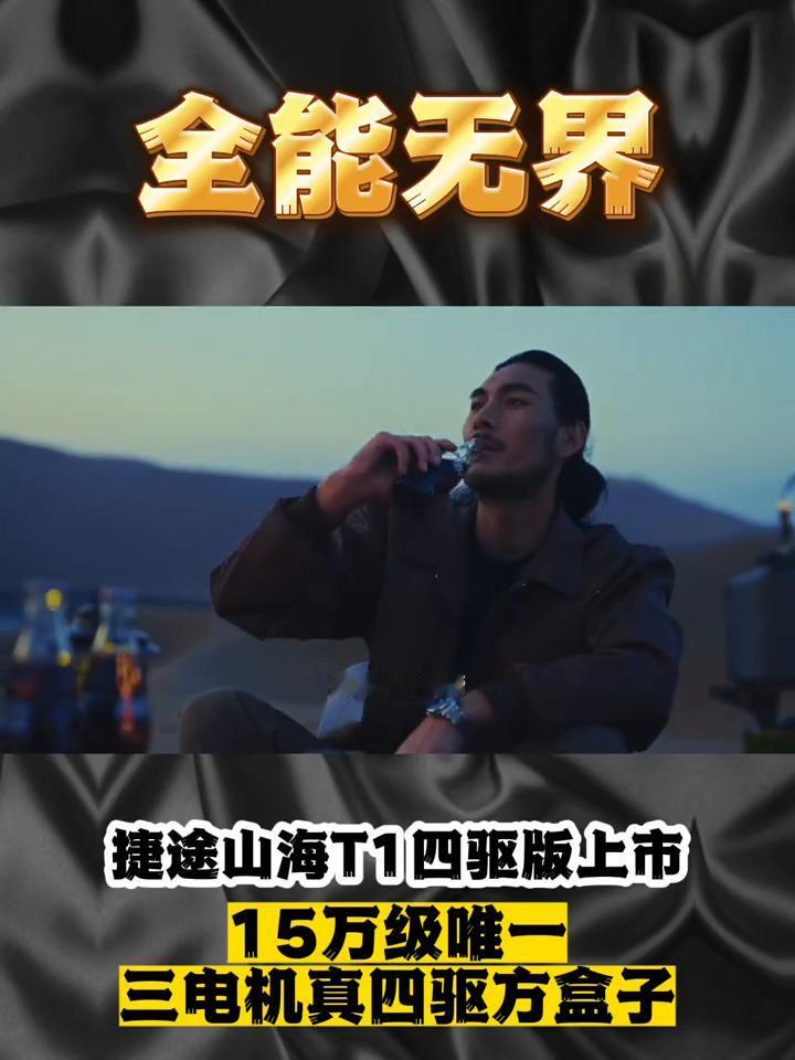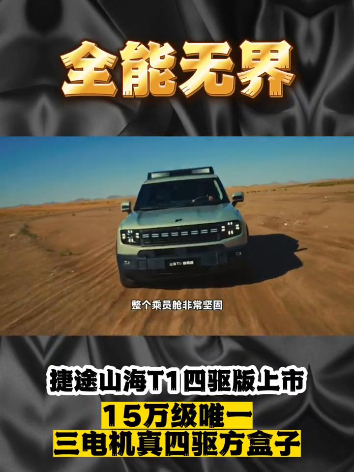 全能无界,捷途山海T1四驱版上市,15万级唯一三电机真四驱方盒子。 捷途山海T1四驱版正式登场了,超级置换抢购价14.99万元起。它的口号是可城可野,全能无界,够有气势吧?它到底硬核在哪? 首先搭载了独有的三电机真四驱系统,综合功率435千瓦,峰值扭矩840牛米,零百加速5.5秒。后桥还配了差速锁,后轮能实现100%扭矩输出,脱困能力相当硬核。200mm离地间隙,600mm涉水深度和100%爬坡度。再加上XWD全自动智能四驱系统反应超快,能自动识别雪地、泥地、沙地等7种路况。 出去野安全是第一位,山海T1在这方面堪称移动的堡垒。车身采用笼式结构,用了大量高强度钢,整个乘员舱非常坚固,细节防护更是到位。电池达到最高的IP68防水等级,还有多层底盘护甲,这份细心真的是把安全刻进了骨子里。 回归生活时,它同样是个舒适惬意的移动之家。226公里纯电续航,城市通勤基本可以实现零油耗,综合续航超过1500公里,跑长途也是说走就走,毫无里程焦虑。 车内2810mm的长轴距带来了超宽敞的空间,放倒后排座椅秒变2米的双人大床,再配上双层隔音玻璃带来的静谧感和对外放电功能,无论是露营看星空还是午后小憩,都是惬意的移动空间。 划重点,捷途山海T1四驱版精准地切中了消费者对于15万级全场景SUV的所有渴望,它面面俱到的能力,尤其三电机真四驱真安全带来的实在感,能助你拓展生活半径,成为伴你穿越城市与旷野的全能伙伴。