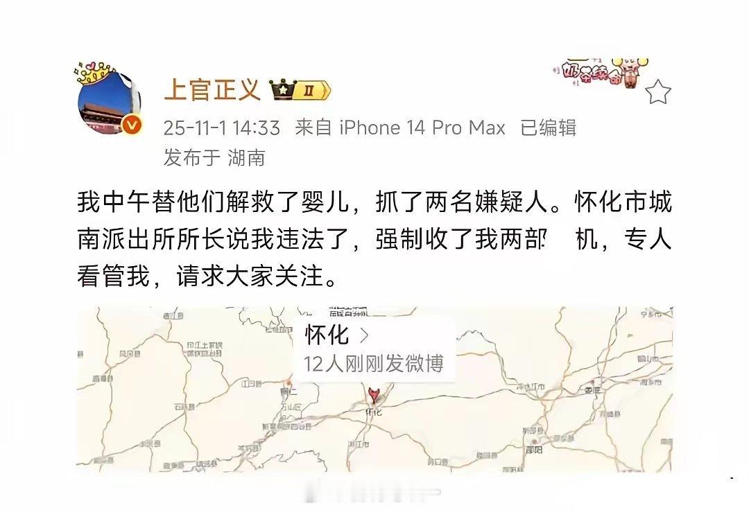 “我中午替他们解救了婴儿,抓了2名嫌疑人。怀化市城南派出所所长说我违法了,强制收了我两部手机,专人看管我,请求大家关注。”
