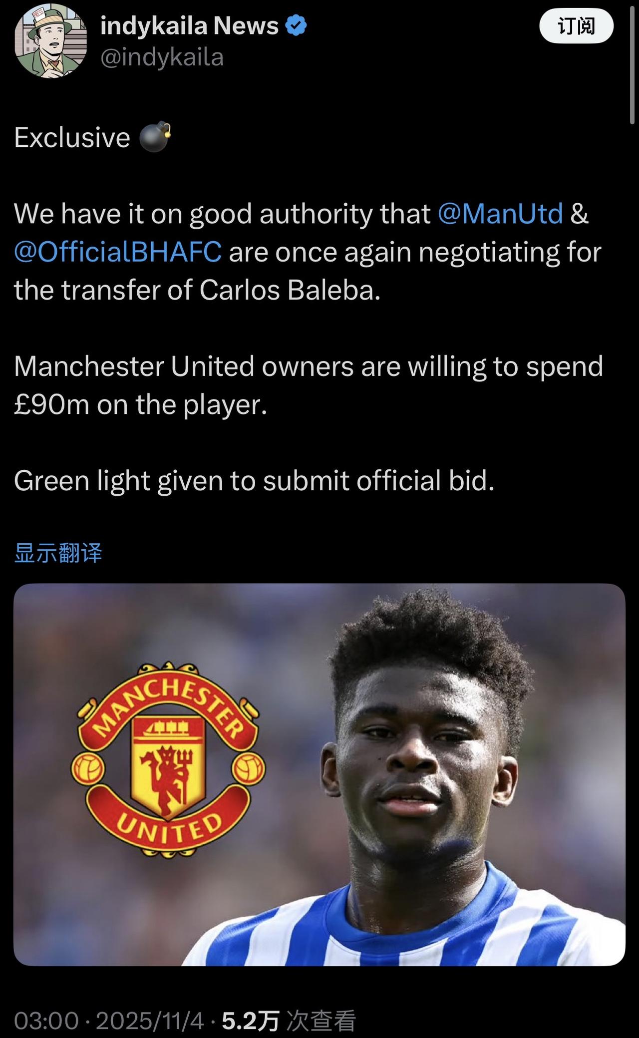 绿帽哥的新鲜独家: 🔴我们有可靠消息来源称, 曼联和布赖顿正在再次就卡洛斯·巴莱巴的转会进行谈判。 🔴曼联老板愿意花费9000万英镑签下这名球员。 🔴已获准提交正式投标书。 🔵巴莱巴也不容易,用2个月时间,硬生生踢掉自己2000万英镑身价[呲牙]