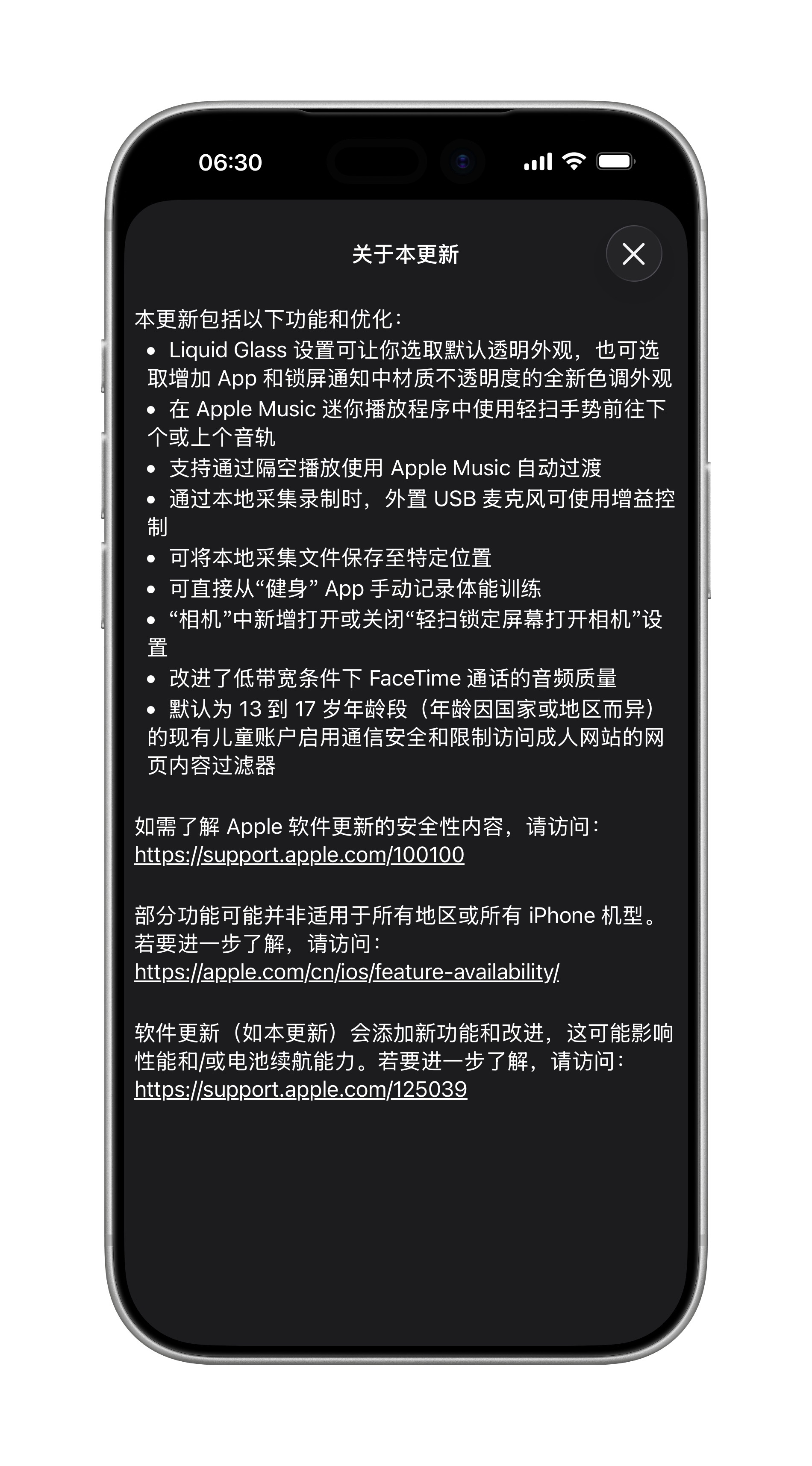 兄弟们,新系统的第一个大版本升级来了,苹果在半夜5点直接推送了iOS26.1正