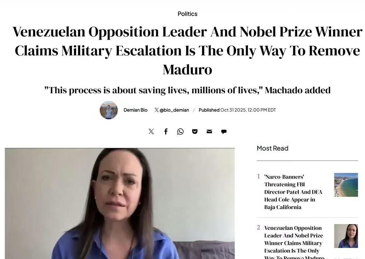 诺贝尔和平奖2025年得主委内瑞拉反对派玛丽亚·科里娜·马查多呼吁美国打击委内瑞拉,委内瑞拉现任总统马杜罗在去年利用选举非法夺取了总统权力,所以推翻马杜罗政权不会是传统方式的政权更迭,因为他不是合法总统,而是毒品恐怖组织的头目,委内瑞拉反对派随时准备接管政府,并会得到军方和警察的支持,因为他们中有80%以上的人正在加入反对派,反政府可以立即成为接管现行政府有序过渡的一部分。 和平奖呼吁用非和平方式推翻现政权。 一个宣扬外来军队用武力推翻本国合法政权的人,在中国叫“汉奸”,在他们本国叫“委奸”应该不过分吧?! 现在看明白了吗?诺贝尔和平奖给了"名声",你必须要做政治的事。