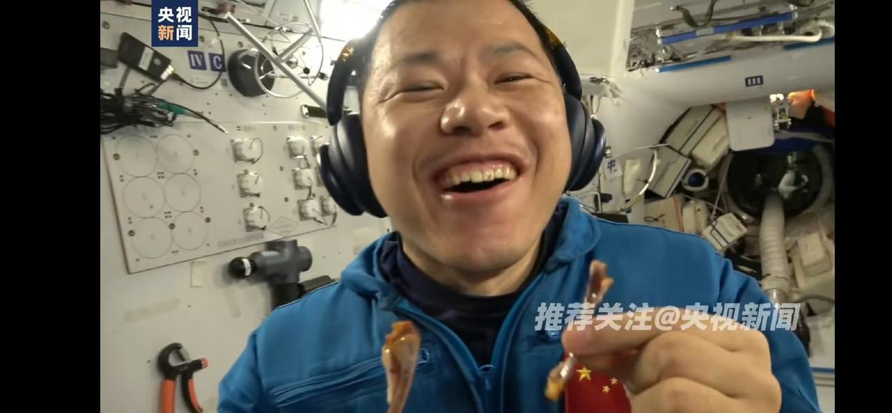 中国空间站可以吃烧烤了。我还一直天真的以为他们在吃压缩饼干。先合影,再吃饭,这和地面生活是一样的啊。果然没有什么事是一顿烧烤解决不了的,包括在太空。 看王杰吃鸡翅,显然是吃美了,再整点儿小啤酒就更完美了。普通生活的一种浪漫表达。