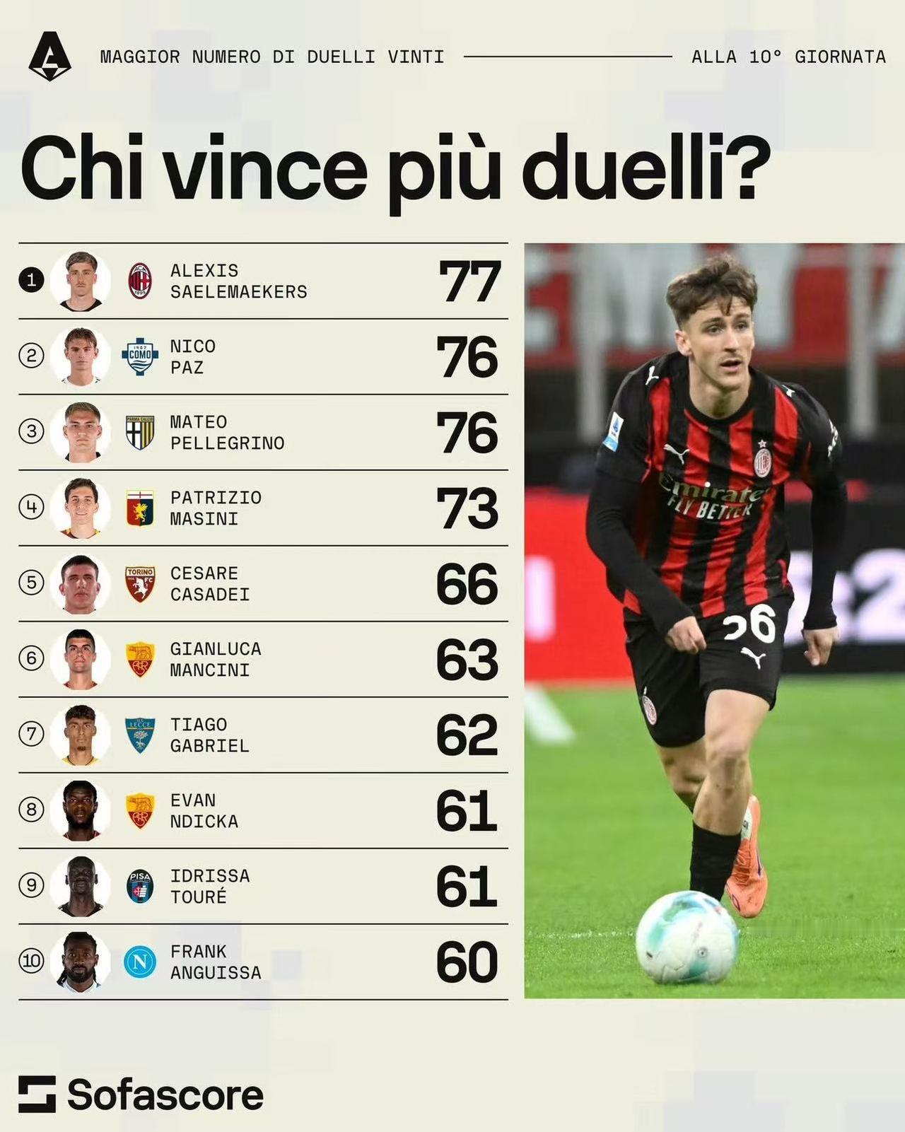 萨56身价暴涨! 本赛季最新统计,米兰的萨勒马科尔斯以77次对抗成为意甲之王,这份榜单中,没有任何一位国际米兰和尤文图斯球员上榜。萨勒马科尔斯租借罗马回归以来涨球非常明显,目前英超球队想要买走他最少要4000万欧以上。