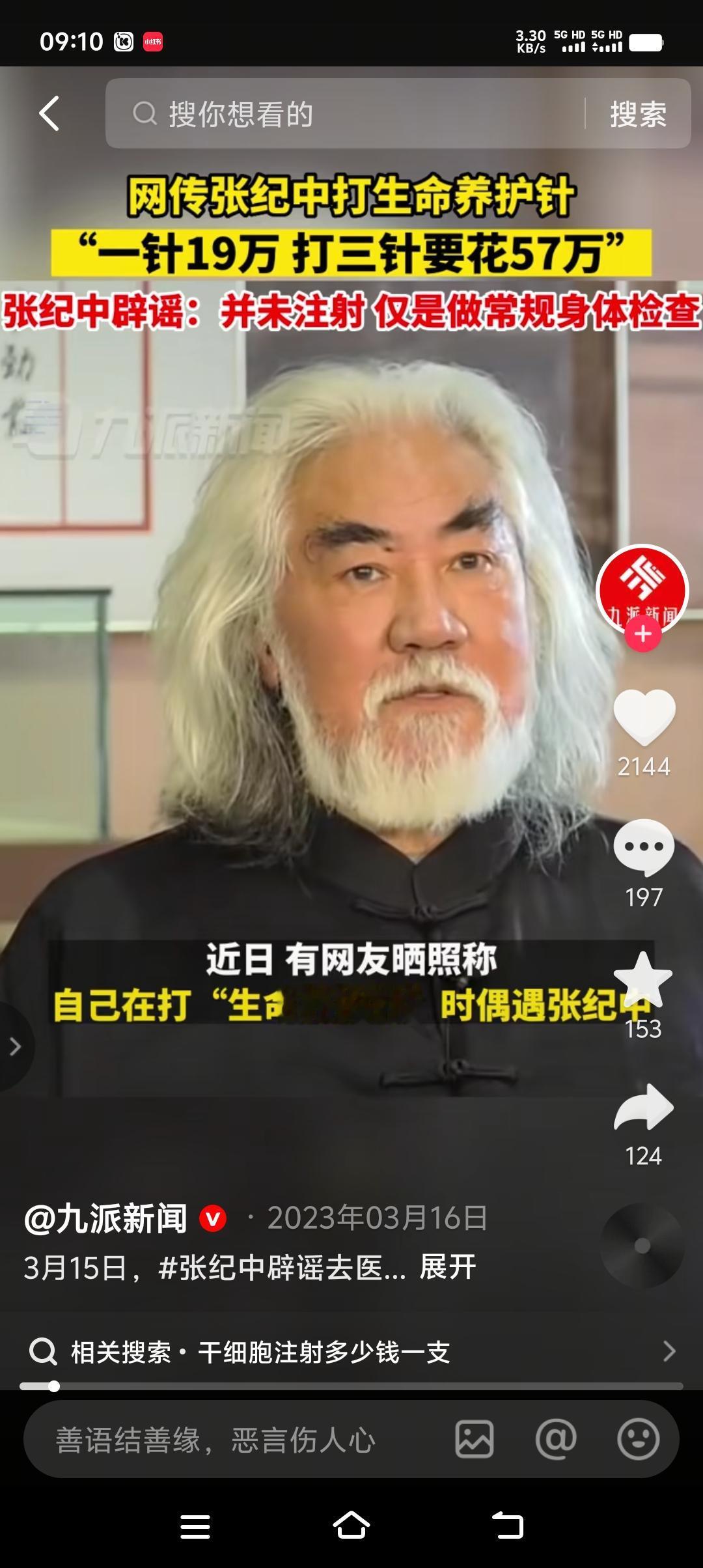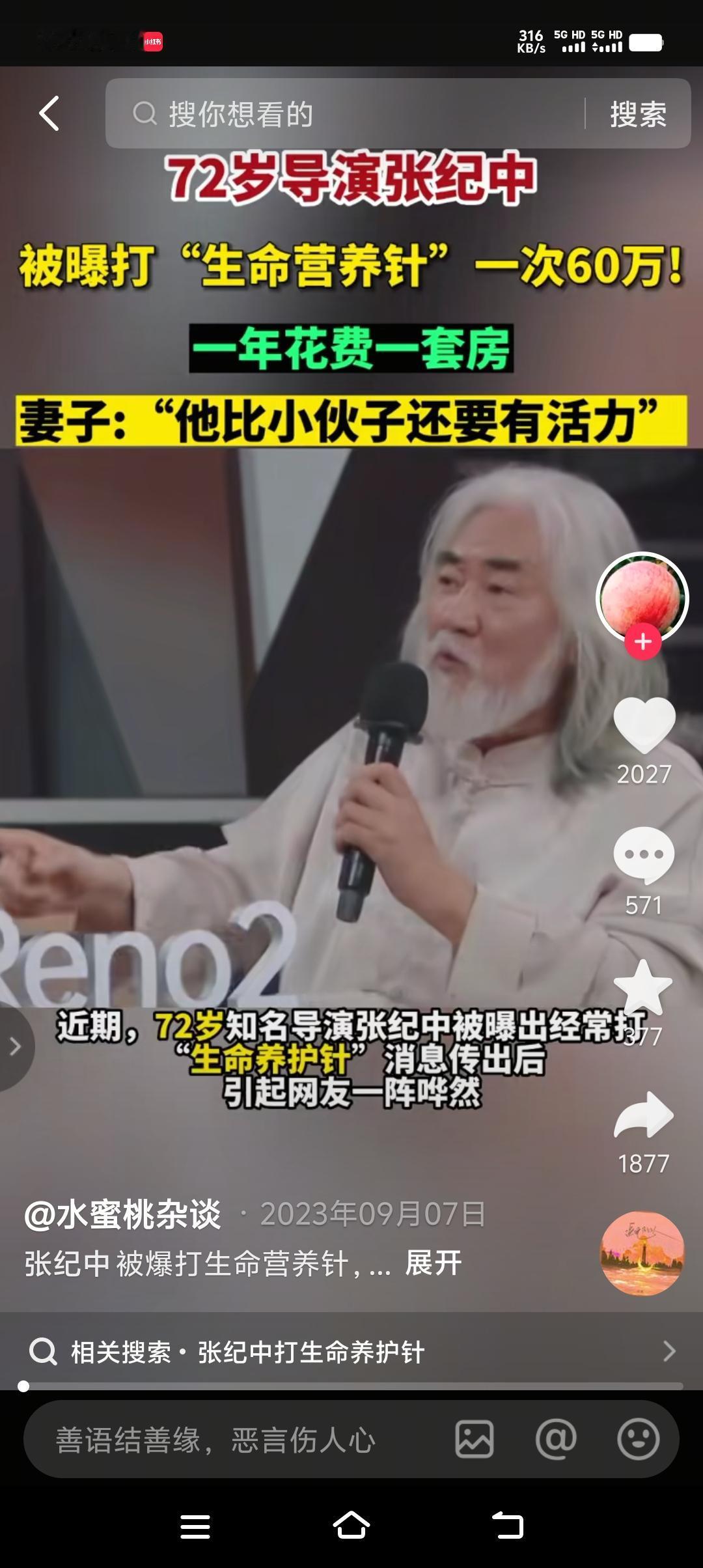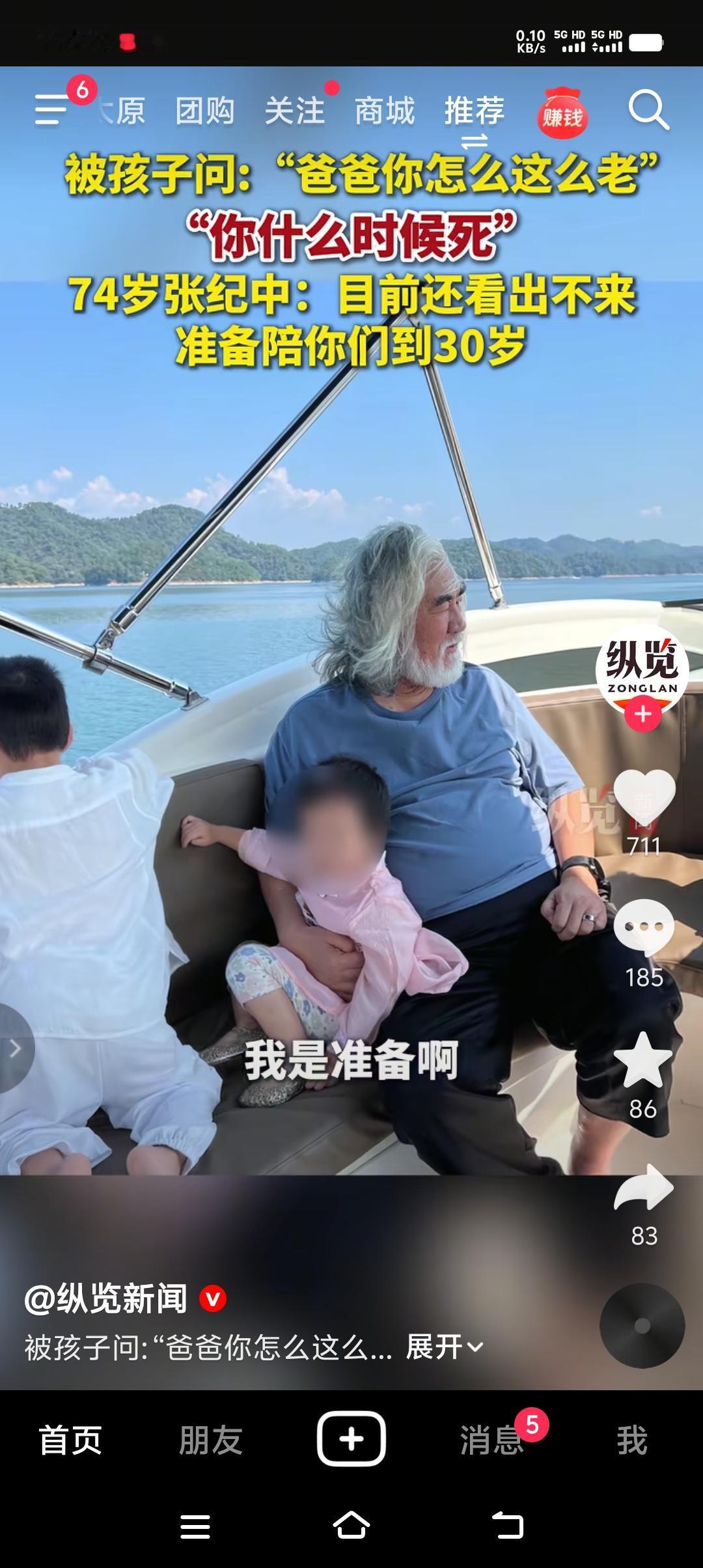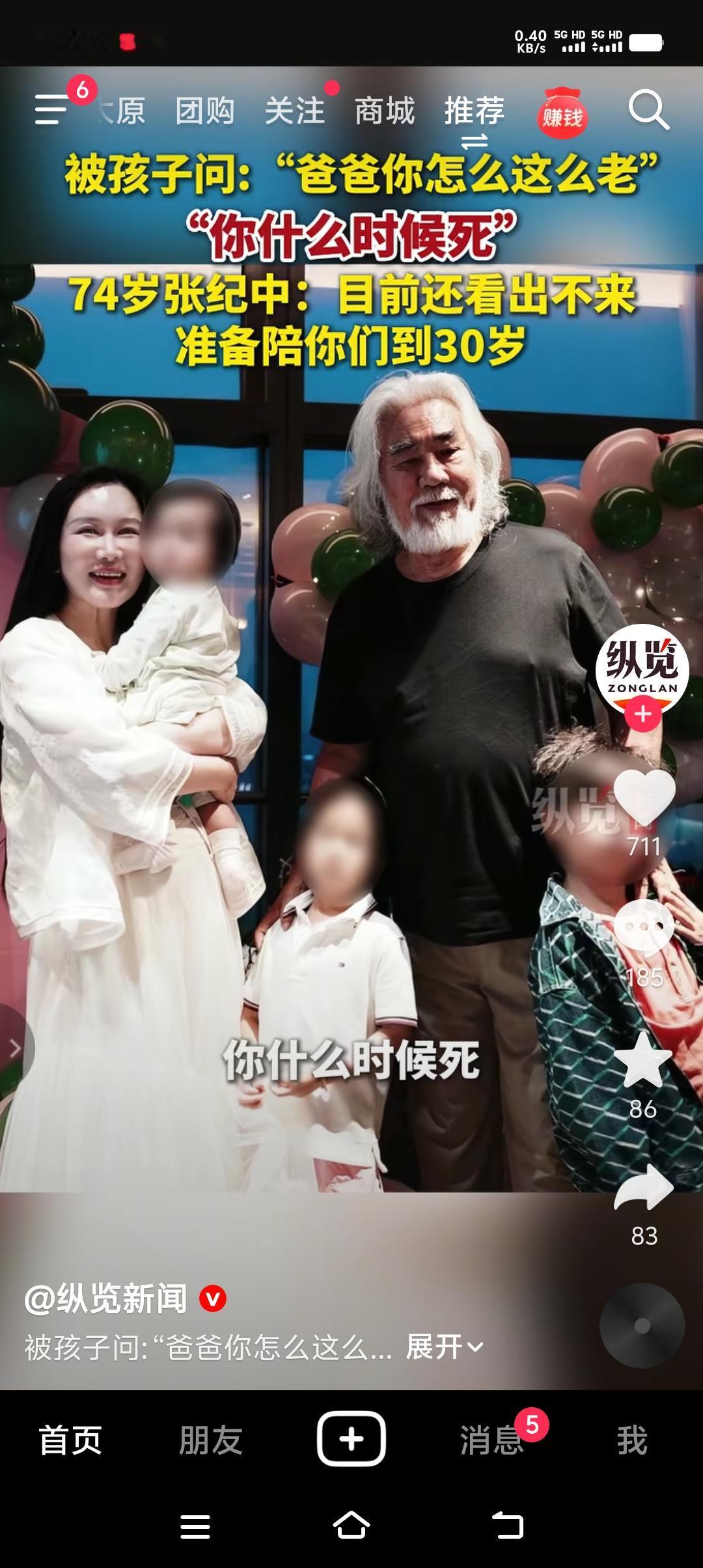 孩子问张纪中“爸爸你什么时候死”?张纪中说现在目前还看不出来,我准备陪你们到30岁,你们上大学,你们大学毕业。 孩子又问张纪中“爸爸你怎么这么老”?张纪中说不是我这么老,你也会老。 童言无忌,73岁当父亲,也难怪孩子会问出这样的问题。“生命营养针”一次60万,一年花费一套房,娇妻杜星霖说他比小伙子还有活力。所以说有钱人就是好,做别人做不到的事情,享别人享不到的福。虽然人生结局都一样,但过程不一样,此生值了!