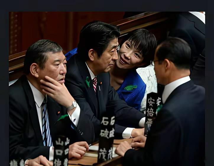 一张高市早苗和安倍晋三的相片,旁边还正好有看起来一脸困惑的石破茂。