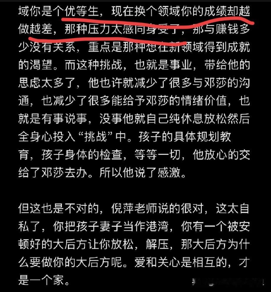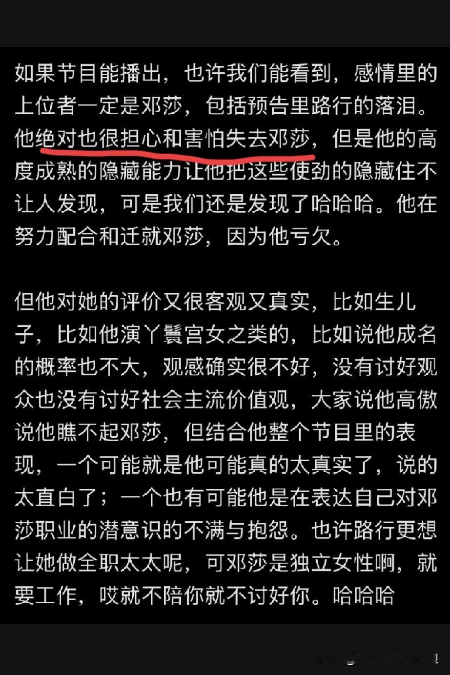 看到一个博主分析路行,说得还挺客观合理的。 路行能在40岁左右就做到建行支行副行长的位置,还是在北京,说明他在金融方面的能力还是非常强的。 这点毋庸置疑。 但是好的资本家,不一定是好的企业管理者。这点,从路行的公司上市之后的表现就能窥探一二。 他在节目上也说了,这十年的重点几乎都是在企业上,对家庭肯定是忽略了太多。 再见爱人开播前,路行辞职了。说不定就是在这趟旅行中有所顿悟,想回归家庭了。 毕竟看过节目的都能看出来,路行还是非常爱邓莎的,他不想和邓莎离婚,不想失去现在这份平静的幸福。 可惜,观众看不到这个改变的心路历程了。[捂脸]