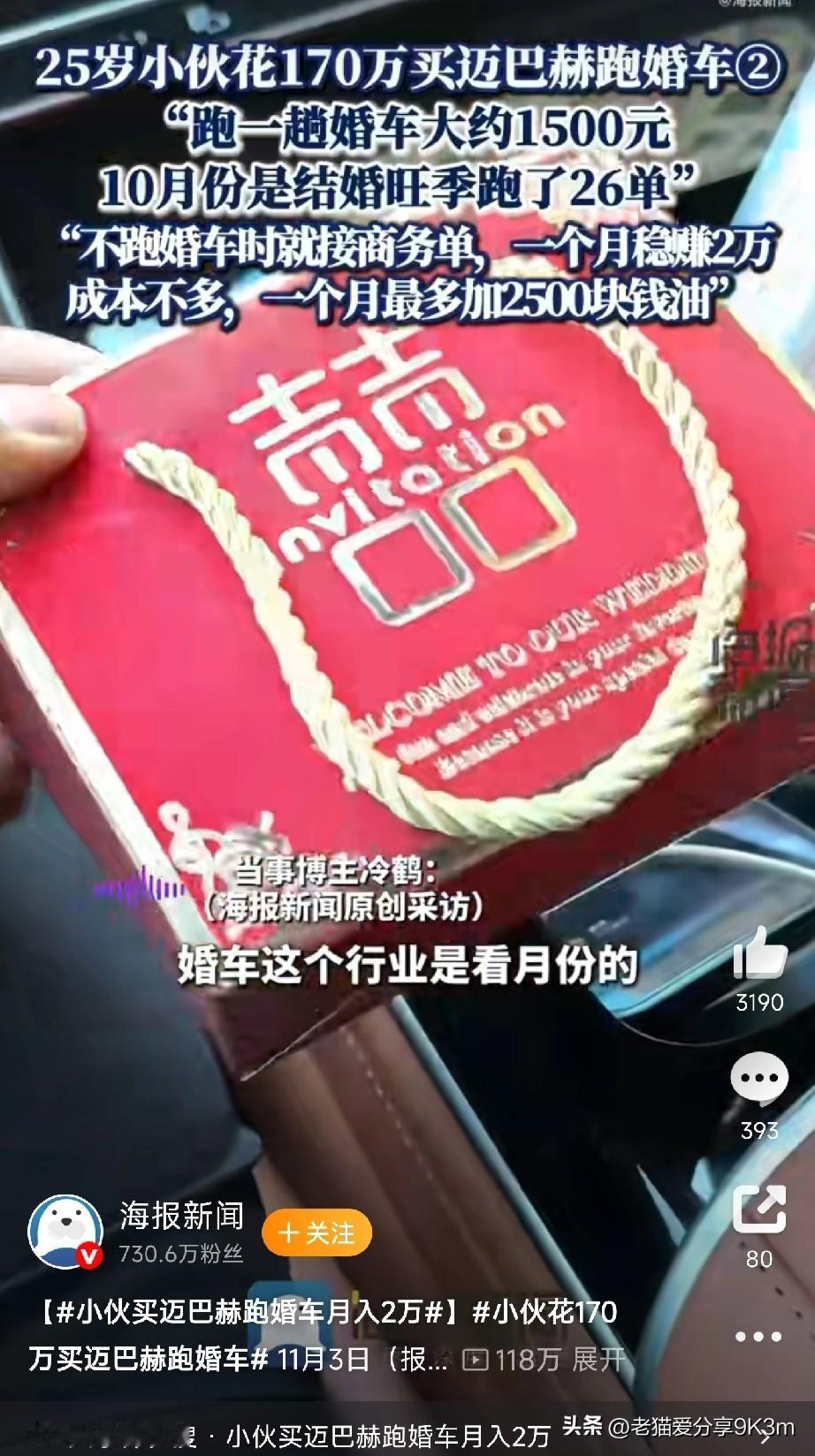 别急着羡慕! 小伙170万买迈巴赫跑婚车,月入2万背后藏着这些真相。 看到这新闻,估计很多人第一反应都是:现在跑婚车这么赚钱?170万的迈巴赫,贷款100万,月供1万9,居然还能月入2万? 先别急着眼红,我给大家算笔账: 旺季确实可观,10月跑26单,按1500元/单算,毛收入3.9万。 -但扣除月供1.9万、油费2500,实际到手约1.75万。 -这还没算保险、保养、违章等隐形开销。 更关键的是: 1️⃣ 婚车市场有淡旺季,冬天和淡季可能连续几天没单 2️⃣ 170万豪车的贬值速度惊人,3年车龄可能直接腰斩 3️⃣ 长期高负荷行驶,4万公里后维修成本会直线上升 有人问这是不是“骗你买迈巴赫”的软广?要我说,这更像是“资源变现”的案例——小伙子本身是博主,有社交平台引流,普通人盲目跟风需谨慎。 真正值得借鉴的是他的思路: 把负债资产变成生产工具, 利用旺季红利密集创收, 结合自媒体放大资源价值。 所以啊,赚钱的门道从来不在车上,而在开车人的脑袋里。你觉得呢? (文章素材来自海报新闻,侵删)