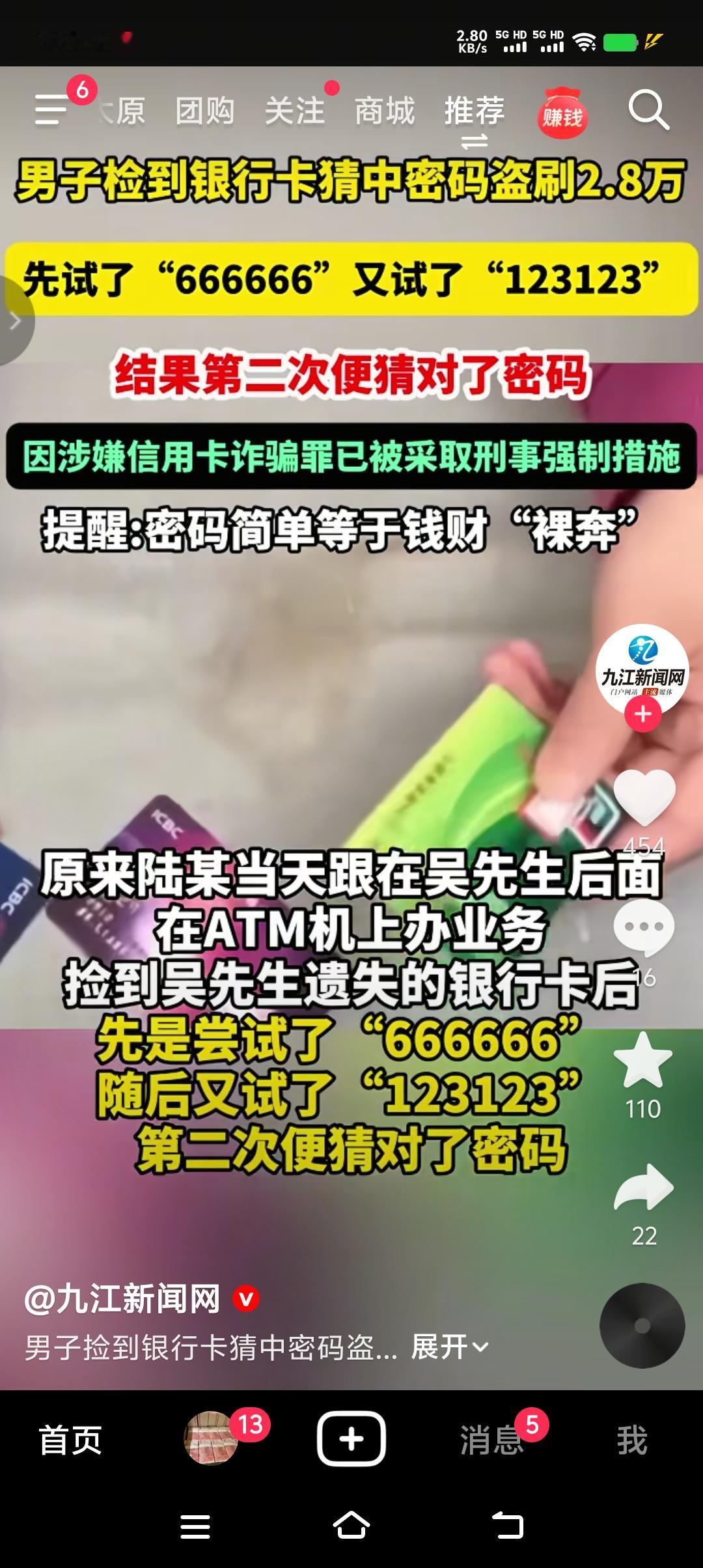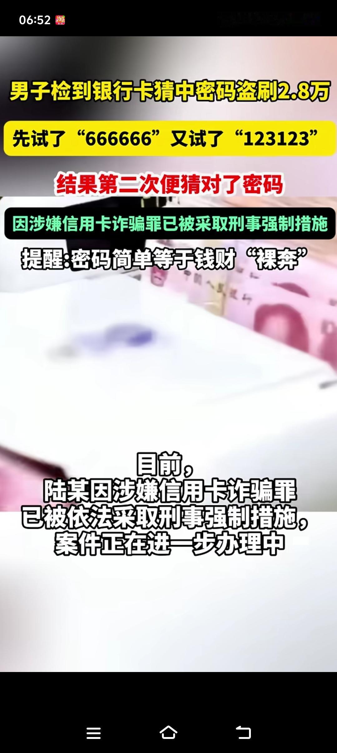 银行卡密码简单等于钱财“裸奔”,男子捡到银行卡猜中密码盗刷2.8万,第一次试6个6没成功,第二次试123123成功破译。不是嫌疑人有多聪明,而是我们持卡人的密码太随意。 六个0,六个8,123456,258258…,相信这些简单便于记忆的密码,大多数人都设过,尤其是老年人。其实这样的六位数密码等于设了个寂寞,一旦丢失或落入犯罪分子之手,那是分分钟钟轻易被人把钱取走。等你发现了,已经成了空卡一张。所以说设密码不是让你便于记住,而是为了不给别人有机可乘。