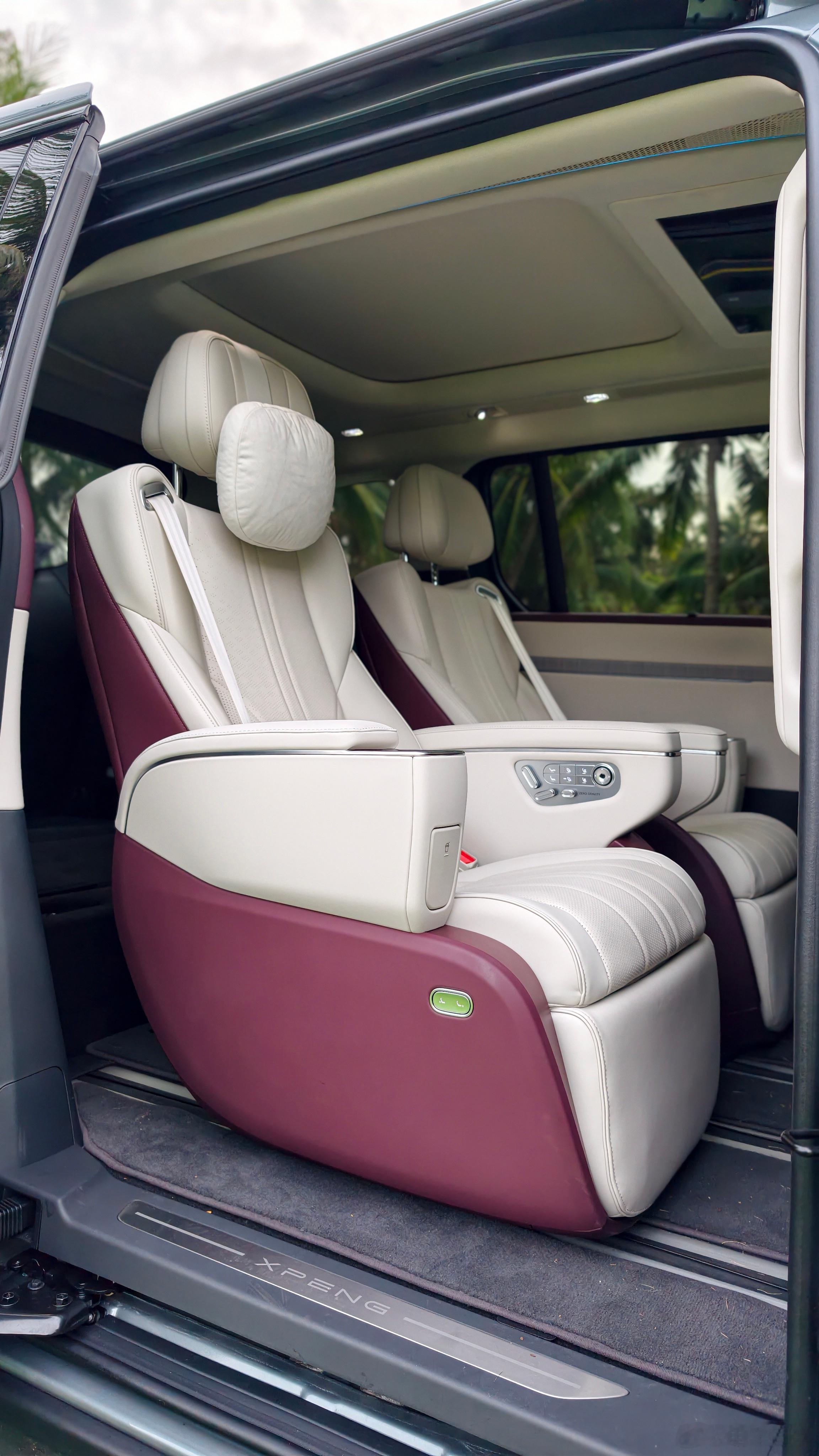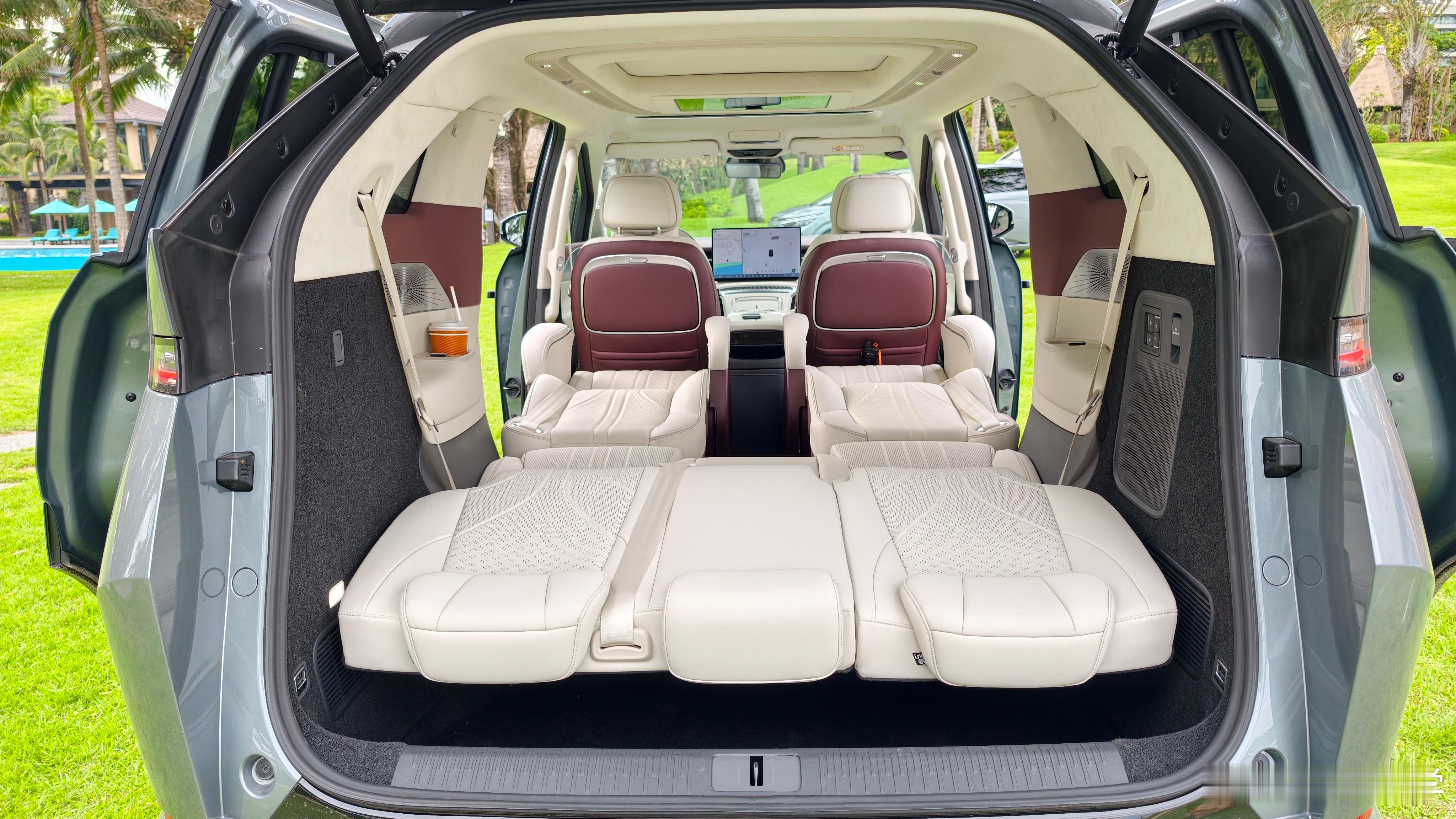 更值得一提的是,全车 7 张座椅每一张座椅的靠背都可以向后和坐垫形成 180 度纯平放倒,再适配官方的充气垫,你能在车内得到一张超大的大床。