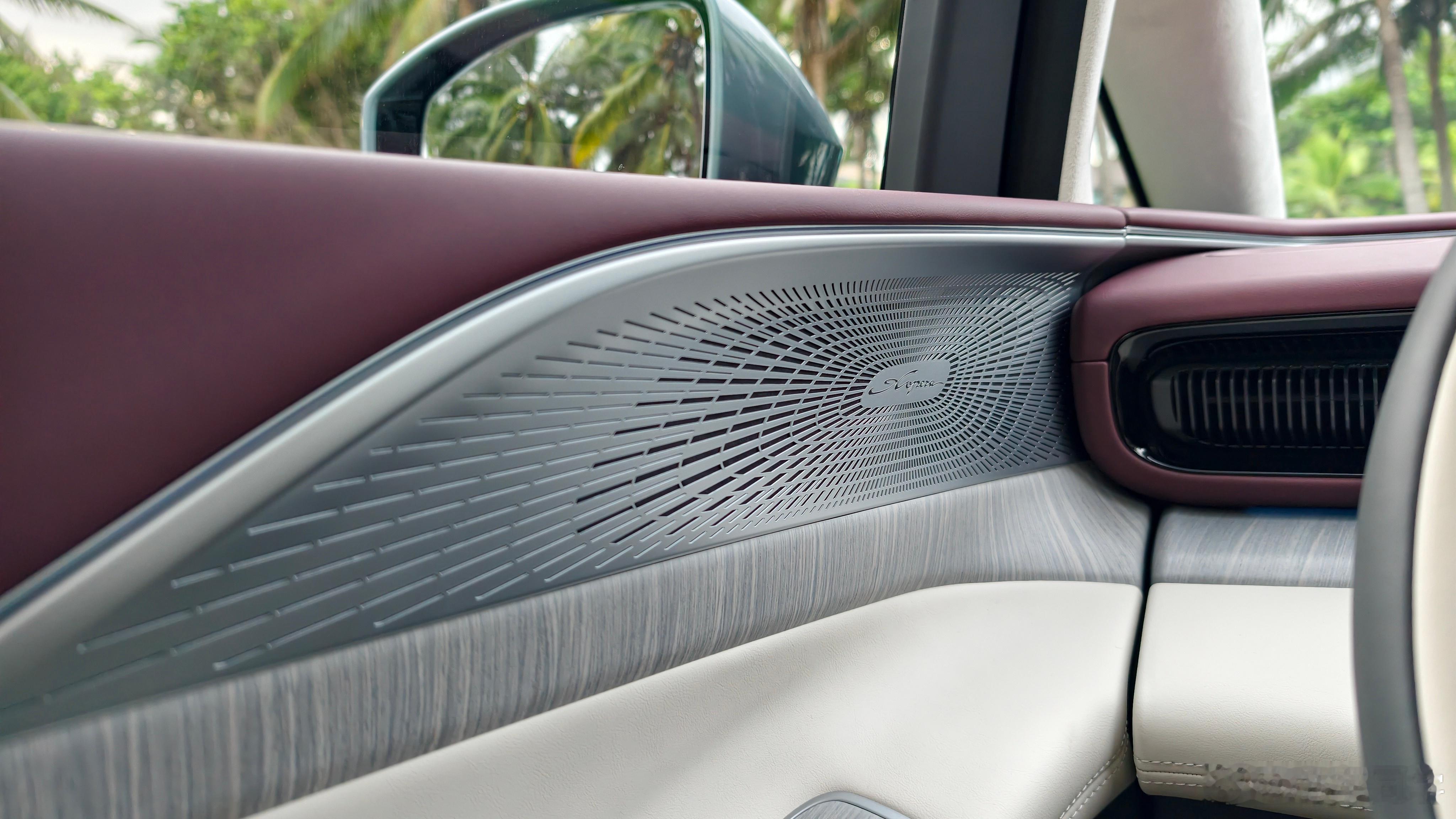 这套从大的布局来看,和纯电版其实也没什么变化。但是细节上,改变还是挺多的,给你的感觉是高级感变强了。比如音响罩,原来纯电版是黑色有点北欧风的风格,但增程版换成了亮面的镀铬饰条,更显性。
