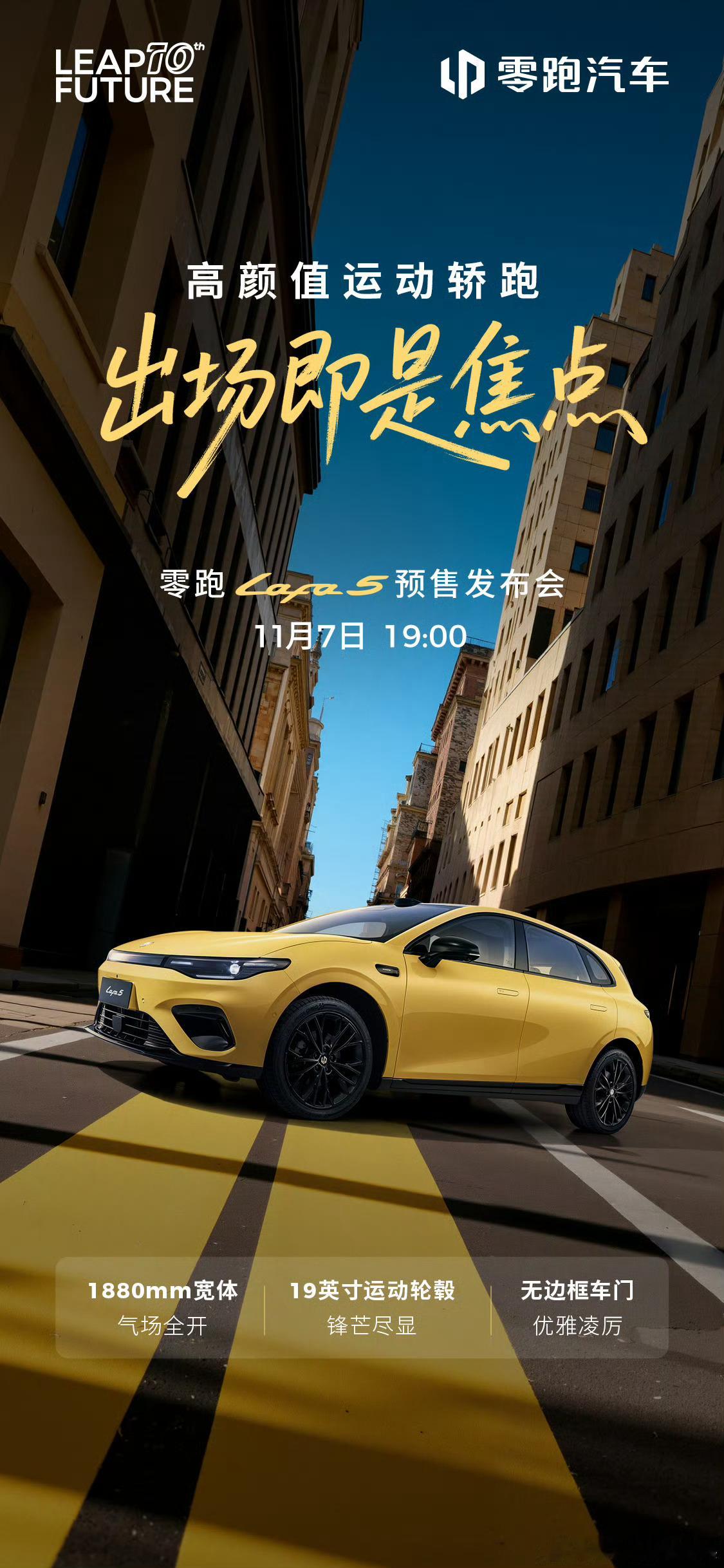 潮流从不等待,硬核科技即刻登场!零跑Lafa5预售正式定档本周五(11月7日) ,基于LEAP3.5架构打造的跨界潮品,把期待值拉满!