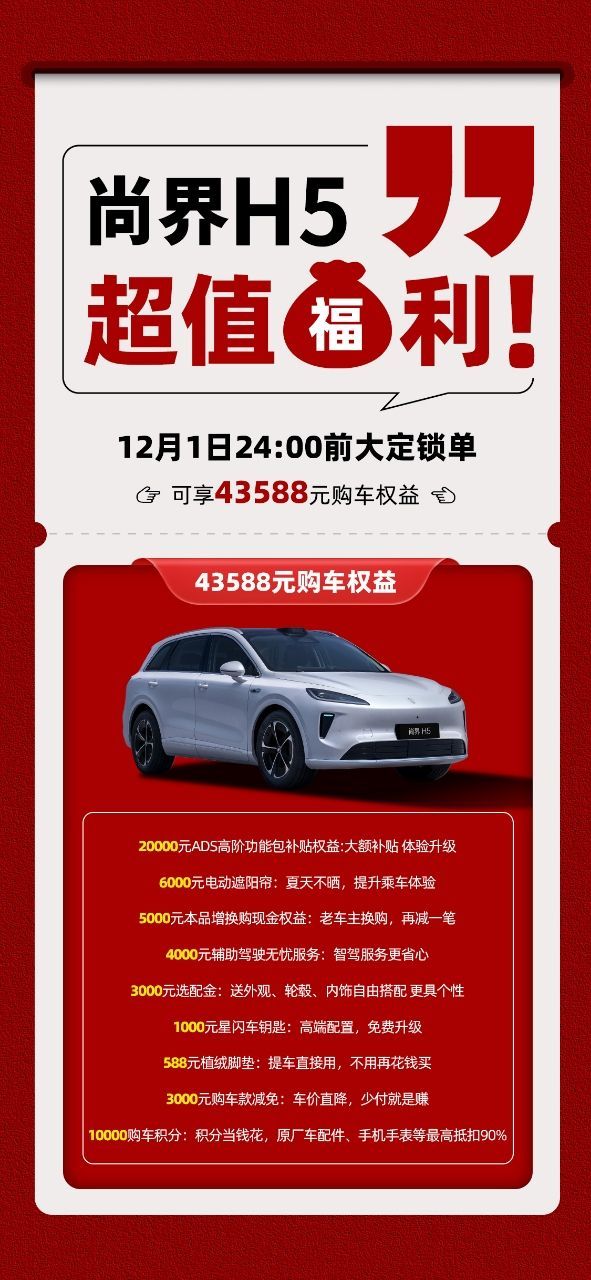尚界H5交付破10000台尚界今天发布交付破万的消息,43天交付1万台,在鸿蒙智行里已经打破记录,黑马体质再次得到印证。不过作为车主,最直接的感受就是这车买得挺踏实。空间够大,续航扎实,平时通勤、周末带家人出门都没焦虑,华为乾崑智驾ADS 4用着也顺手。现在赶上尚界H5跨年购置税补贴方案发布还有43588元限时权益+最高9000元的购置税全额补贴兜底,等于又省一笔。说实话,买车不就图个省心+值当?尚界H5这波,确实拿捏住了。