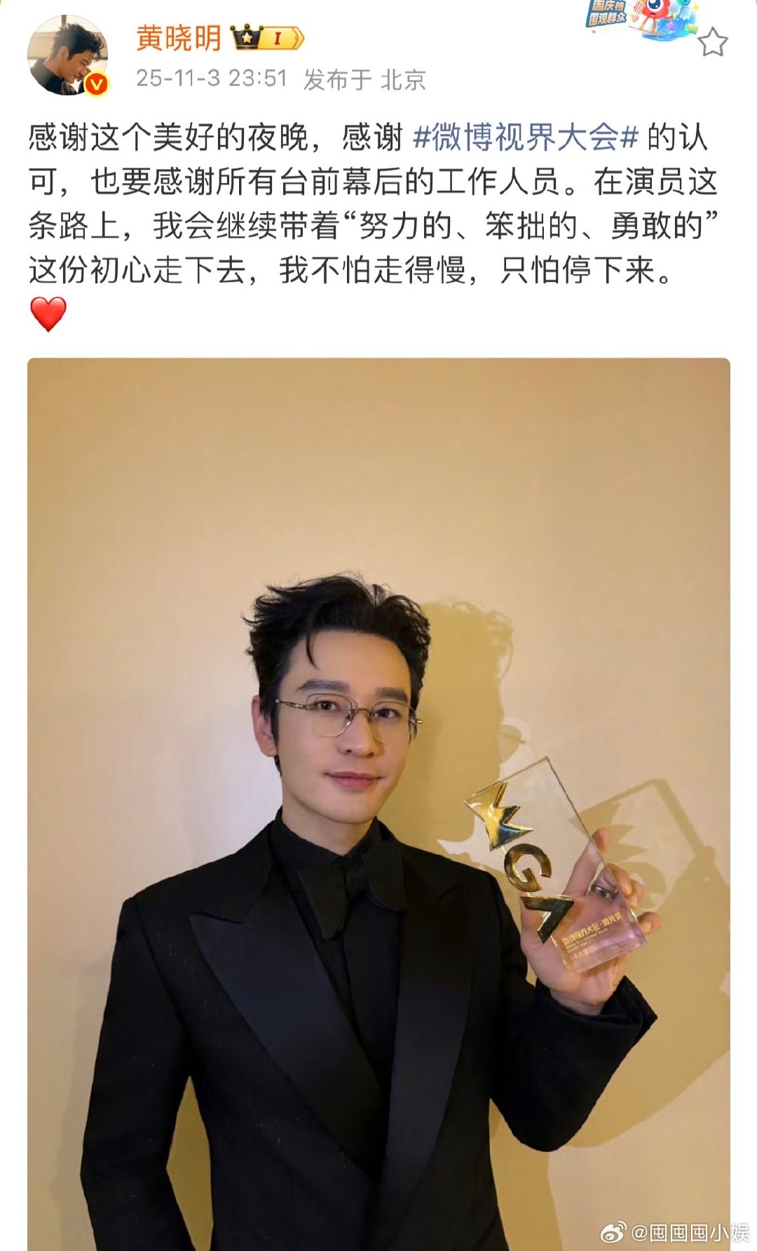 黄晓明获奖后发文黄晓明晒奖杯 黄晓明在微博视界大会的奖杯到手,他说的那句“只怕停下来”,真的是把演员的坚持刻进DNA了。