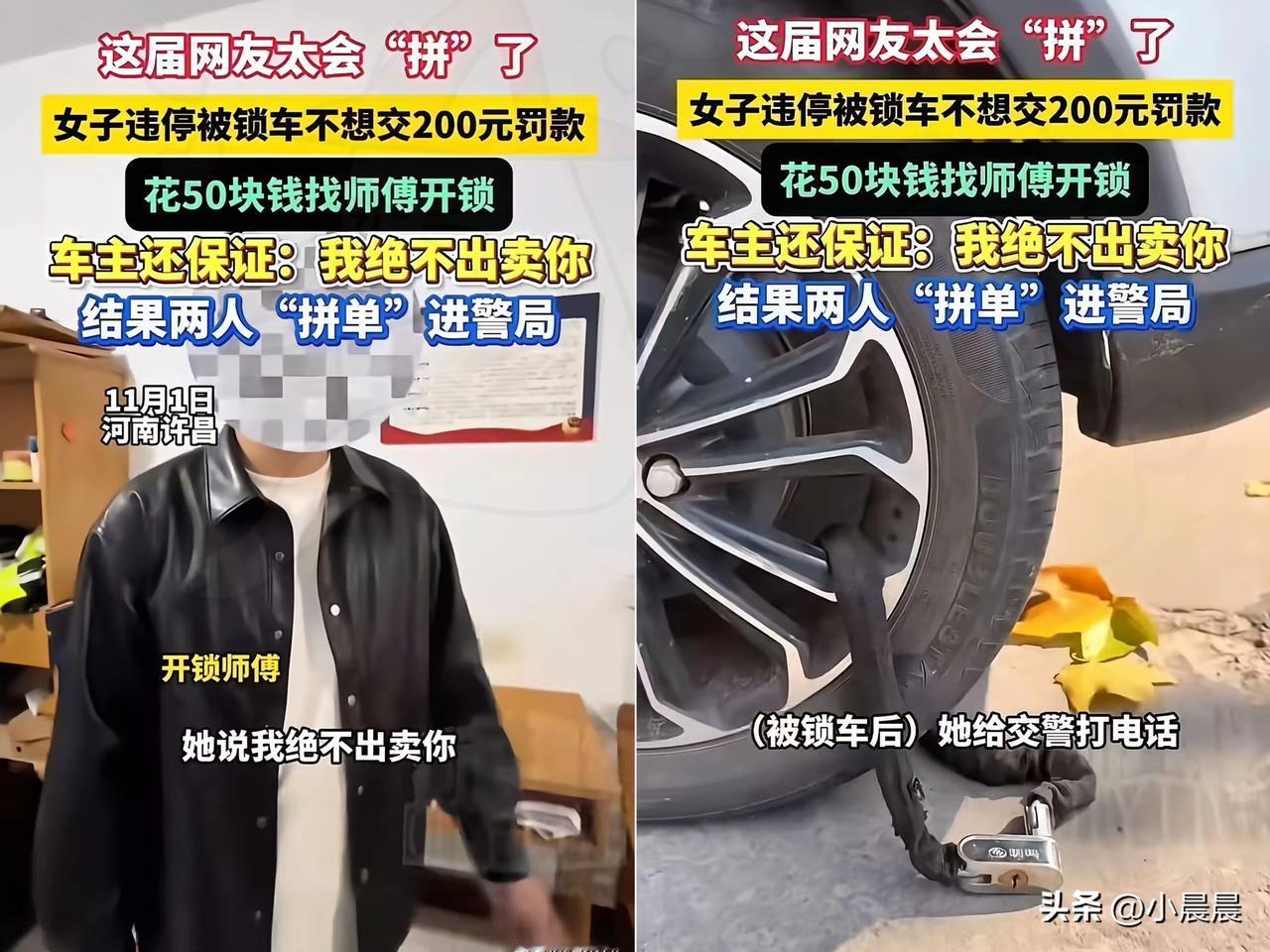 真是害人害己! 河南许昌一女子违停被交警锁车, 本该交200块罚款了事,但是 动了歪心思找开锁师傅“钻空子”,最后俩人双双被带走,这笔账算下来亏到姥姥家! 女子办事图方便乱停车,回来发现车被锁,得知要罚200块后心疼不已,竟想到花50块找开锁师傅偷偷解锁。 师傅起初犹豫,但架不住女子“保密”承诺,几秒钟开了锁,俩人还为“省了钱、赚了钱”暗自开心,殊不知全程早被交警掌握。 这哪是省钱,简直是自毁!违停本就是错,逃避处罚更是错上加错,不仅自己要承担更重的责任,还把无辜的开锁师傅拉下水。 别觉得“小事没人管”,法律面前可没那么多“侥幸”,一时贪念可能换来更大代价。 你身边有没有这种“捡小便宜吃大亏”的例子?