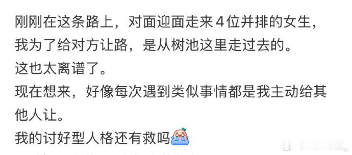 讨好型人格走路 别什么都讨好型人格,这类人其实是礼貌或者以前受到过不公平的对待却无人能帮助祂们,但是祂们还是会因为善良的本性选择牺牲自己的利益。一般遇到这些人我也会行动表达对方值得拥有赞扬和礼貌的
