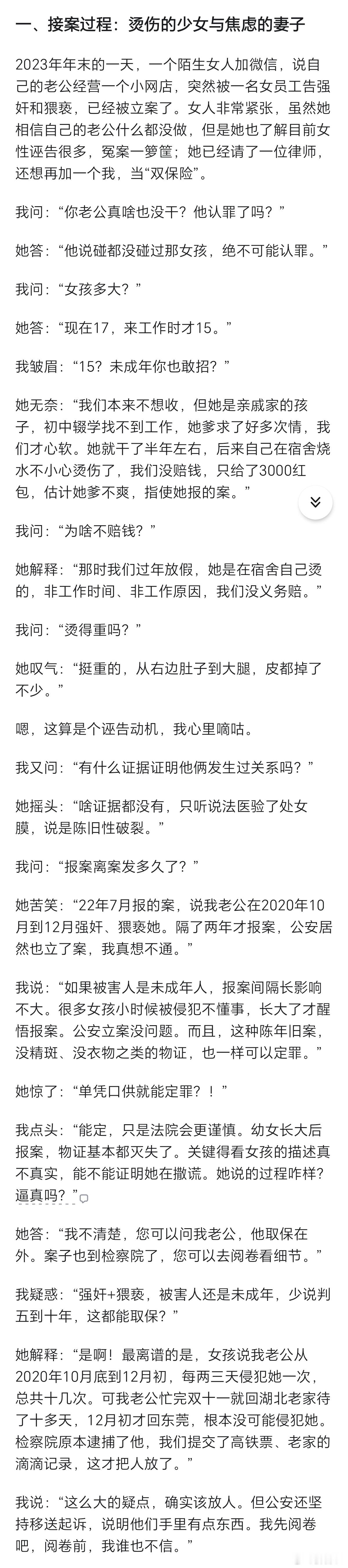 至于发生关系的细节,更是丰富到令人窒息:从当时穿的衣服,衣服怎么被脱掉,到老板办公室的灯光,以及门窗朝向,再到老板的具体动作,J液的问题,以及威胁的话等,丝丝入扣,细致入微。