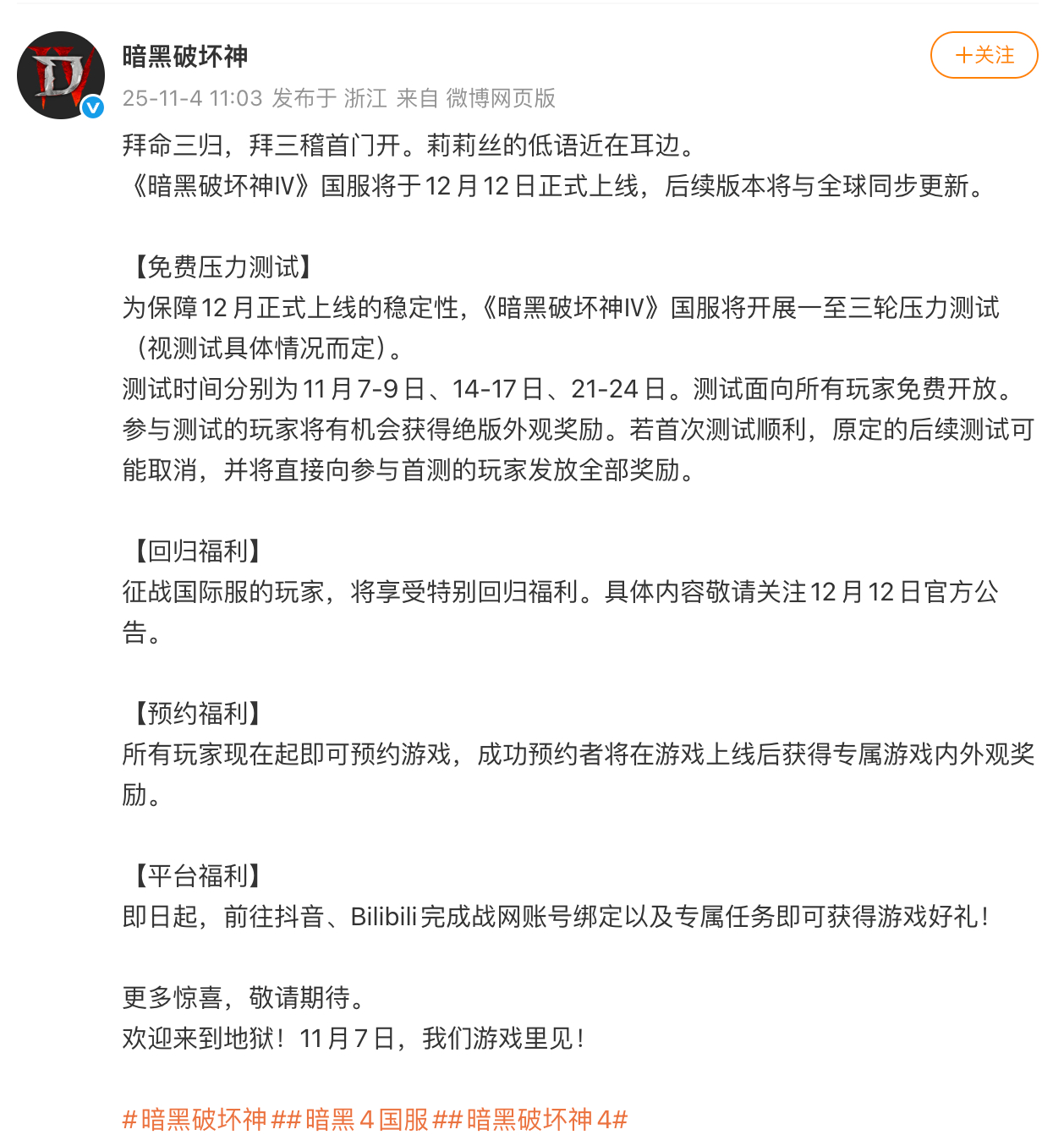 《暗黑破坏神4》国服官宣12月12日正式上线,后续版本将与全球同步更新。《暗黑破坏神4》国服将于11月7-9日、14-17日、21-24日三个时间段开展一至三轮压力测试(视测试具体情况而定)。测试面向所有玩家免费开放,参与的玩家将有机会获得绝版外观奖励。若首次测试顺利,原定的后续测试可能取消,并将直接向参与首测的玩家发放全部奖励。