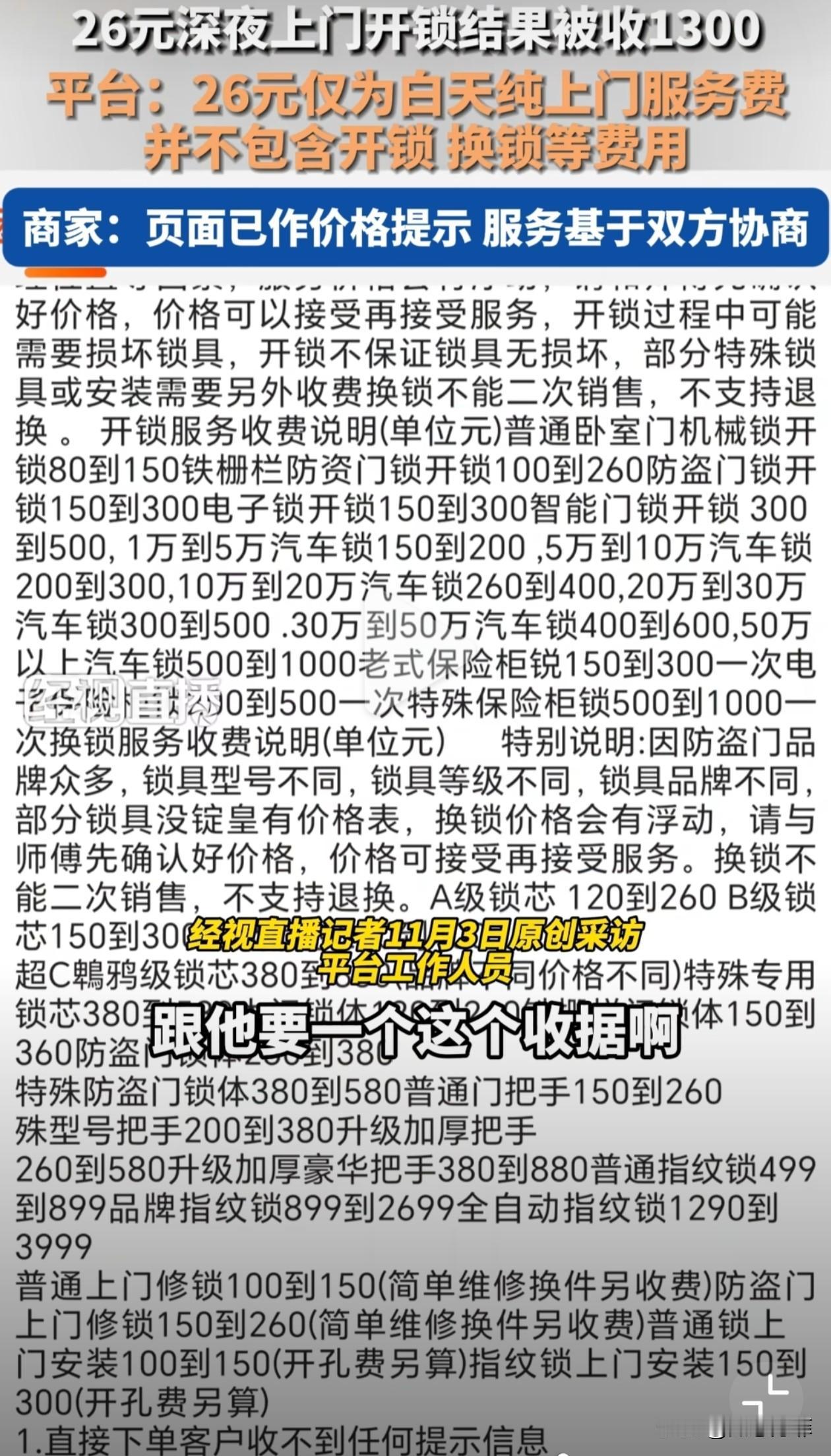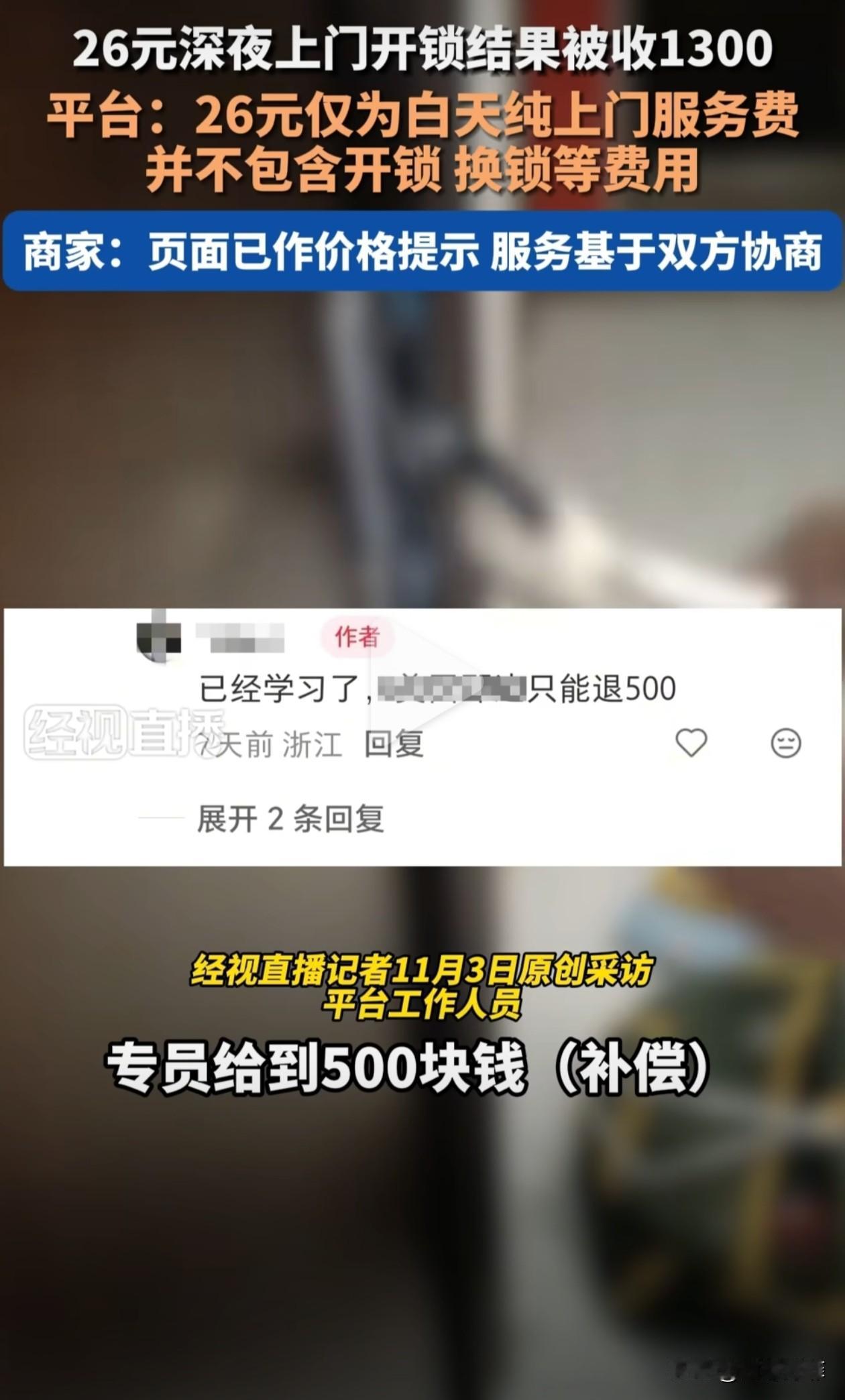 男子忘带钥匙,半夜被锁门外,在平台上下单了26元的上门开锁服务,最后竟然被收1300元。平台:正常价格,26元只是白天上门服务费,不包含开锁。 杭州,男子下单半小时后,开锁师傅到了,他研究了一会,说这锁等级比较高,只能强拆换锁。男子着急进门,没多想就同意了。 师傅换完直接开始报价,锁芯588元,合金把手288元,还有其他夜间服务费,加起来一共1300元。 男子听完直接懵了,询问为什么这么贵,商家说26元只是白天上门费,其他费用页面小字写了,是协商好的。 事后男子觉得被低价套路了,同款锁网购才200多,就在平台投诉了商家。 商家却坚称没强制消费,说师傅上门前会电话沟通价格,现场也会让消费者选锁具档次,不同意的话只付上门费就能终止服务。 最后经过协商,商家退了男子500元,还表示都是正常收费。 大字写26元吸引消费者下单,关键收费信息却藏在角落小字里,深夜大家没心思细看,明摆着趁人之危宰客。 而且同款锁网上只要200多,就算加上服务费,收1300也确实不合理。