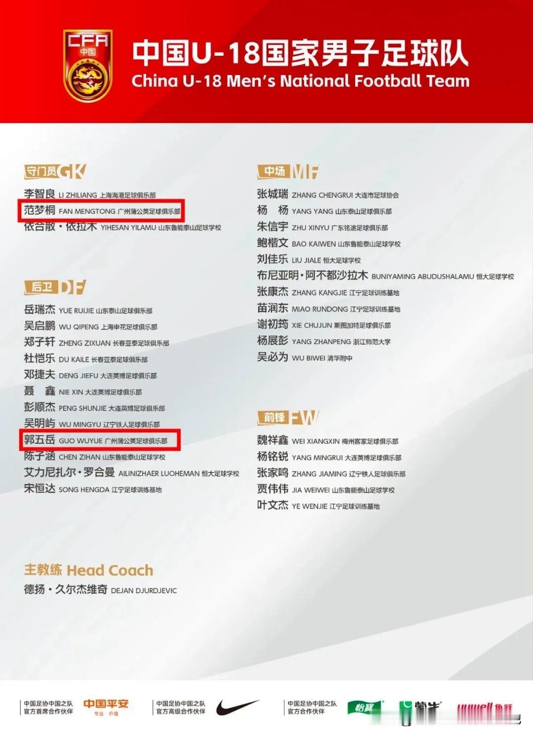 恭喜广州蒲公英队员范梦桐、郭五岳再次入选中国U-18国家男子足球队集训名单…… 这也是继8月份入选集训队后两人再次入选国字号集训队伍!愿两位队员珍视身披国字号战袍的每一段成长时光,始终以热爱为帆、以敬畏为舵,用不懈拼搏勾勒青春底色,为广州荣誉加冕,为俱乐部荣光加码,为国家队辉煌助力。 ——为备战2027年U20亚洲杯,经队伍教练组研究,中国足球协会批准,中国U-18国家男子足球队定于2025年11月6日至11月18日赴上海市组织集训,并与吉尔吉斯斯坦U-18国家男足进行两场封闭教学赛。