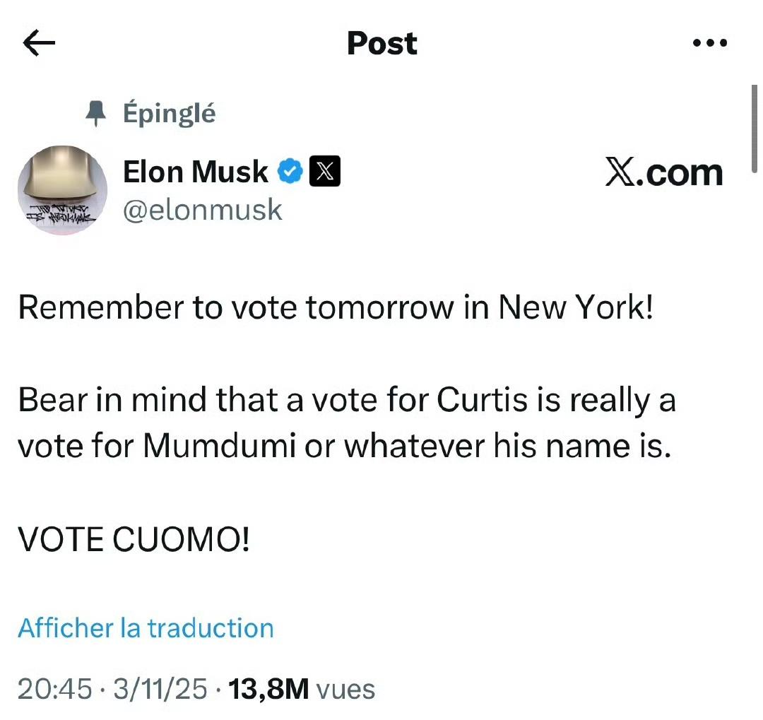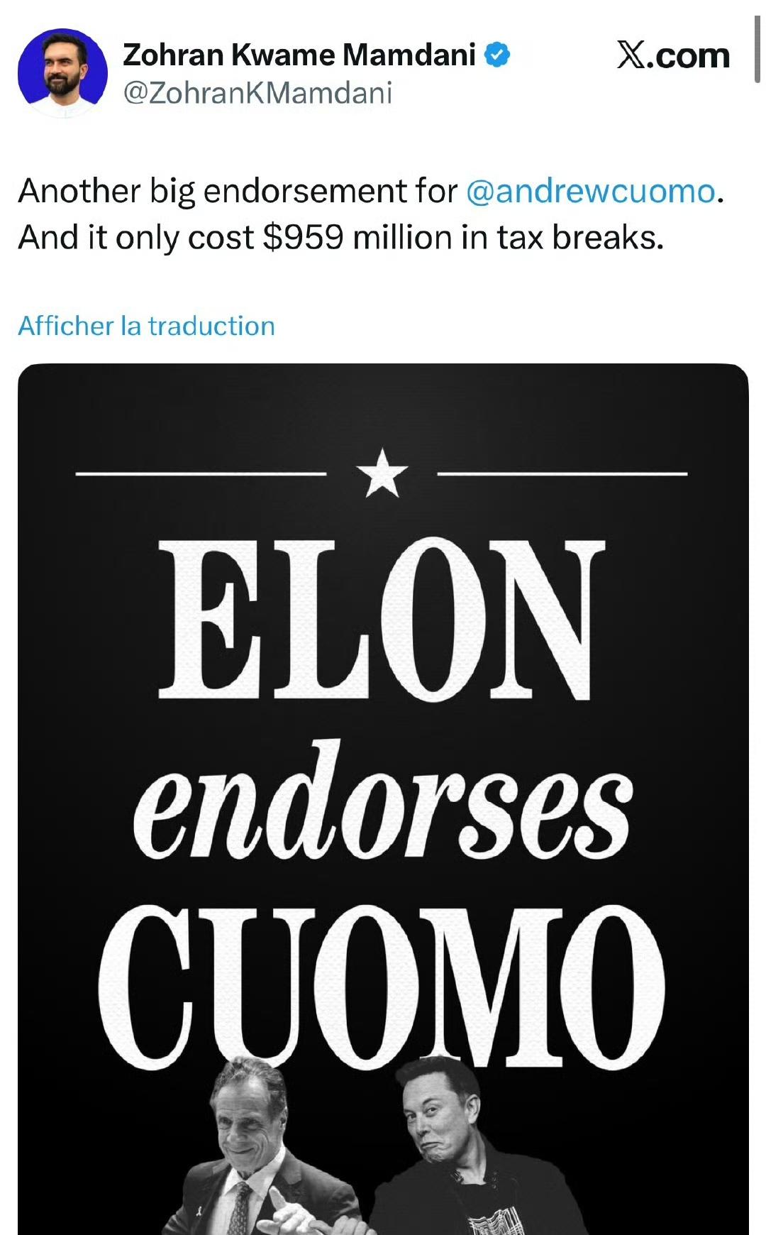 马姆佐尼嘲笑马斯克背书科莫: “而这一切仅仅花费了9.59亿美元的税收减免。” 此前马斯克在社媒发文支持科莫: 明天记得在纽约投票! 记住,投给柯蒂斯的票实际上就是投给穆姆杜米(或者不管他叫什么)。 投科莫! 马斯克故意把马姆佐尼的名字写错了,表达对他的轻视。