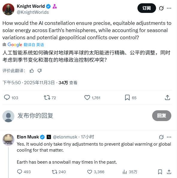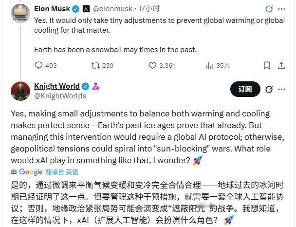 马斯克这个家伙,真可能让AI引发世界大战导致人类毁灭。马斯克昨天发表了一个暴论:用太空轨道上的AI卫星星座来调整太阳光,地球变暖不就解决了。 有人问,先不说这么干会不会引发地球气候灾难,谁也不知道一次错误的调整会不会引发某地的干旱,或者洪水;就说这种气候和能量的分配真的可控,那无法避免的将导致国家之间因为能源公平问题,互相争夺,甚至战争……那场面简直就是绝佳的末日电影设定。 而马斯克却对此不以为然,AI就能解决国家之间精确和公平的问题,所以人类的生存,要由AI的计算来决定了,听起来更特么恐怖了。 而且,马斯克他是世界首富,手里还有SpaceX,不是没有工具的嘴炮杂鱼……