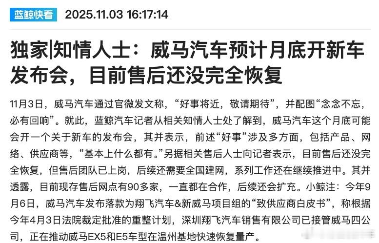 威马此前保有量大概 10 万辆左右,所以每次一有动静被问的最多就是APP、网络和售后,如果月底有发布会,这事应该也要有个交代。新能源汽车