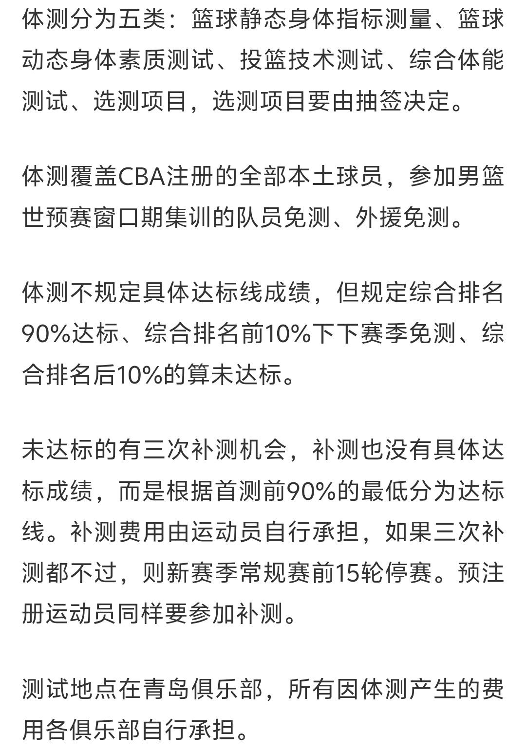 CBA体测完全不应该改成现在这个样子,为什么一个赛季体测排名前10%下赛季就免测呢?以我们球员的自律性,就不应该有免测这一项! 我们可以制定各个年龄段体测要求,比如30岁以前标准,35以后标准,可以允许35岁以后老将减少个别体测项目,但是只要打职业就必须体测! 而且体测不达标只停赛15场太少了,应该是常规赛停赛50%,季后赛全部停赛,并且工资50%应该上交联盟作为其余比赛“上场特例”参赛费!不好好自律就应该得到处罚!