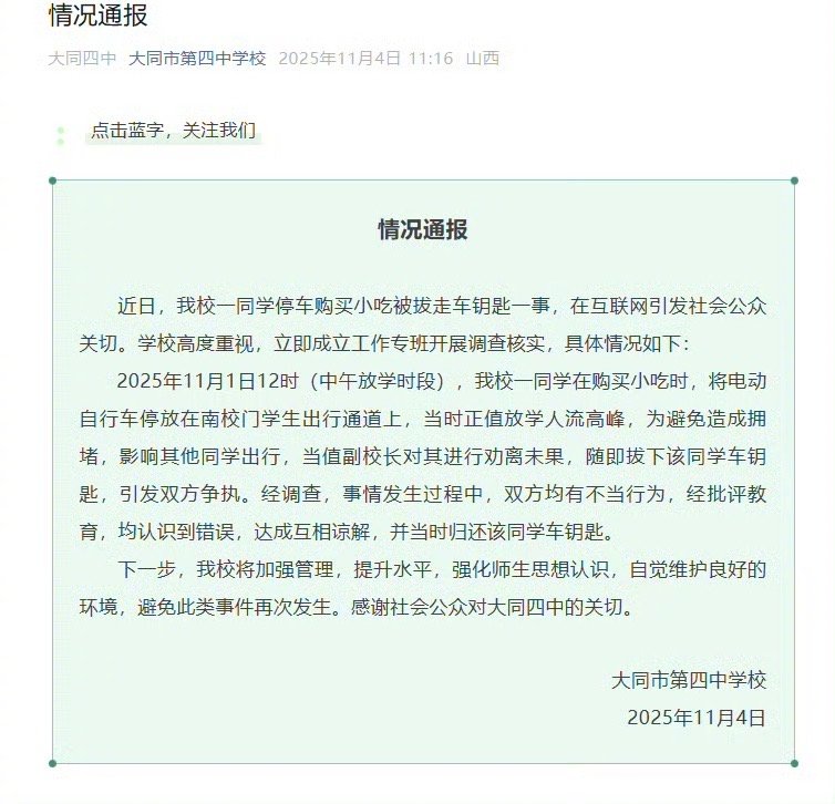 11月4日中午,大同市第四中学校发布情况通报称,2025年11月1日12时(中午放学时段),该校一同学在购买小吃时,将电动自行车停放在南校门学生出行通道上。