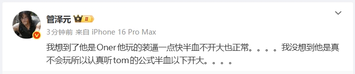 “我想到了他是Oner他玩的装逼一点快半血不开大也正常。。。。我没想到他是真不会玩所以认真听tom教练的公式半血以下开大。。。。”